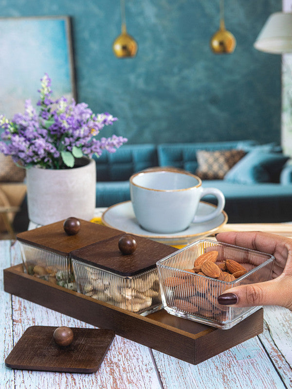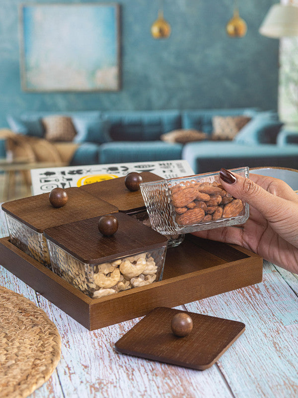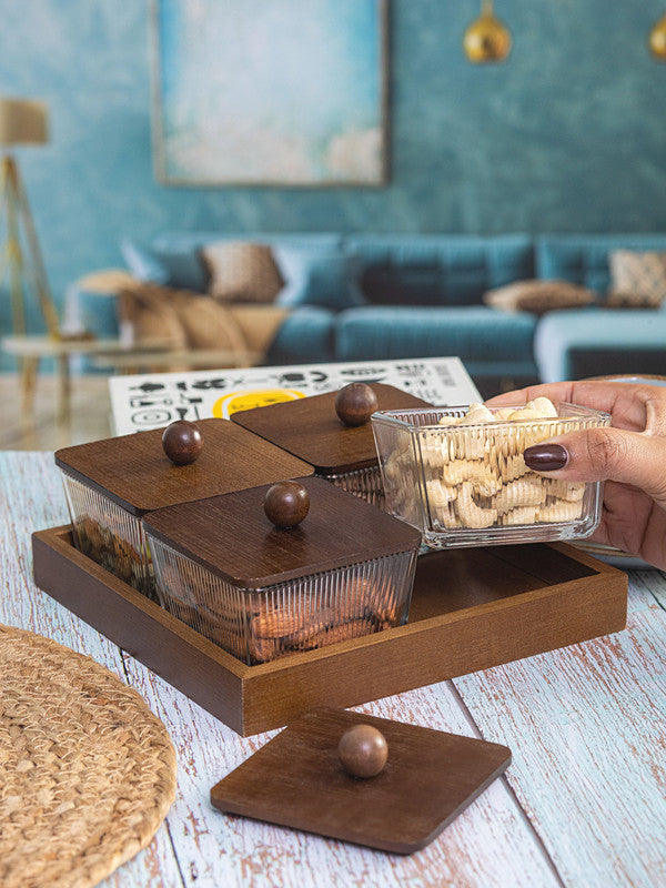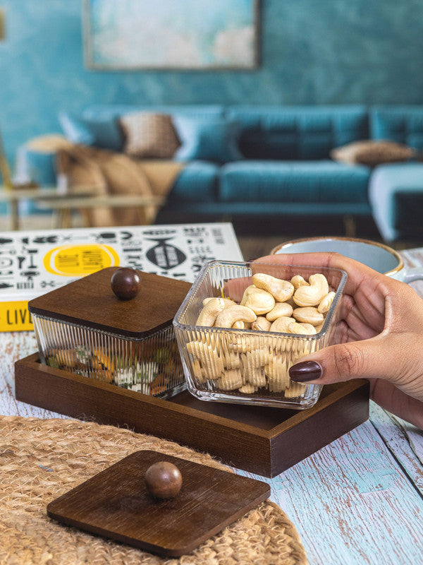 Goodhomes Glass Bowl With Wooden Lid & Tray (Set of 5pcs)
