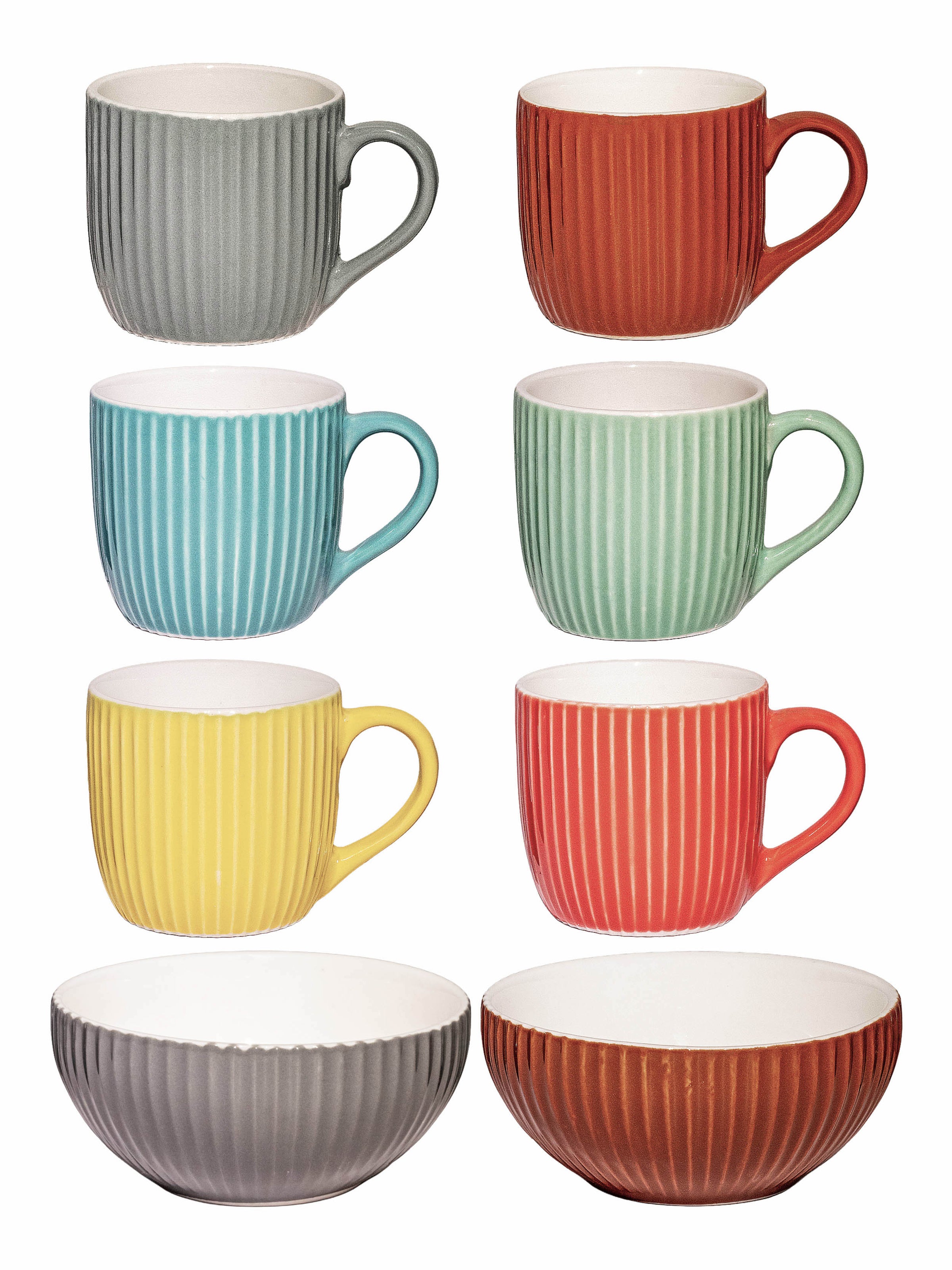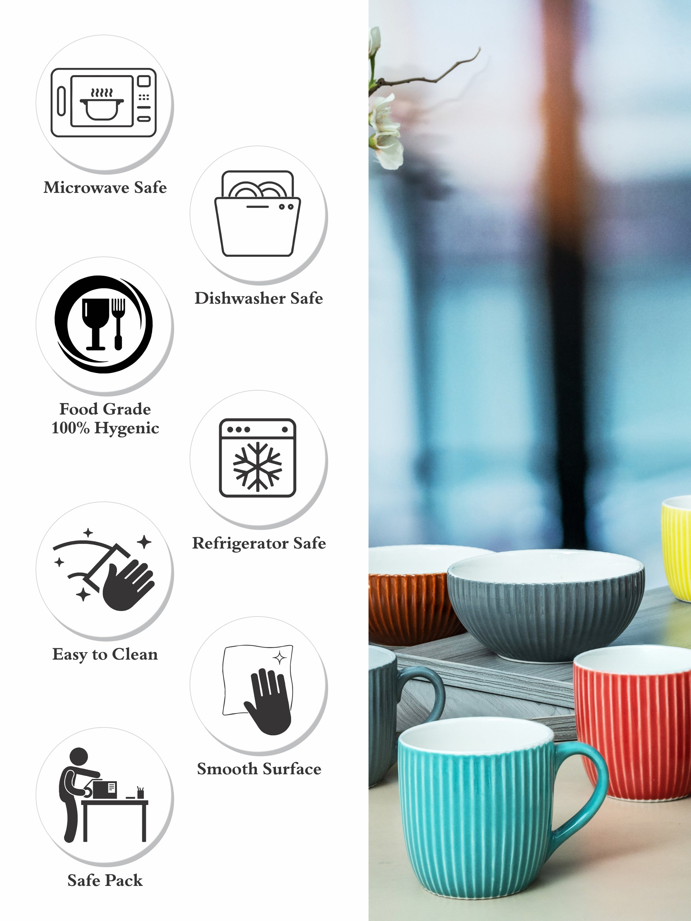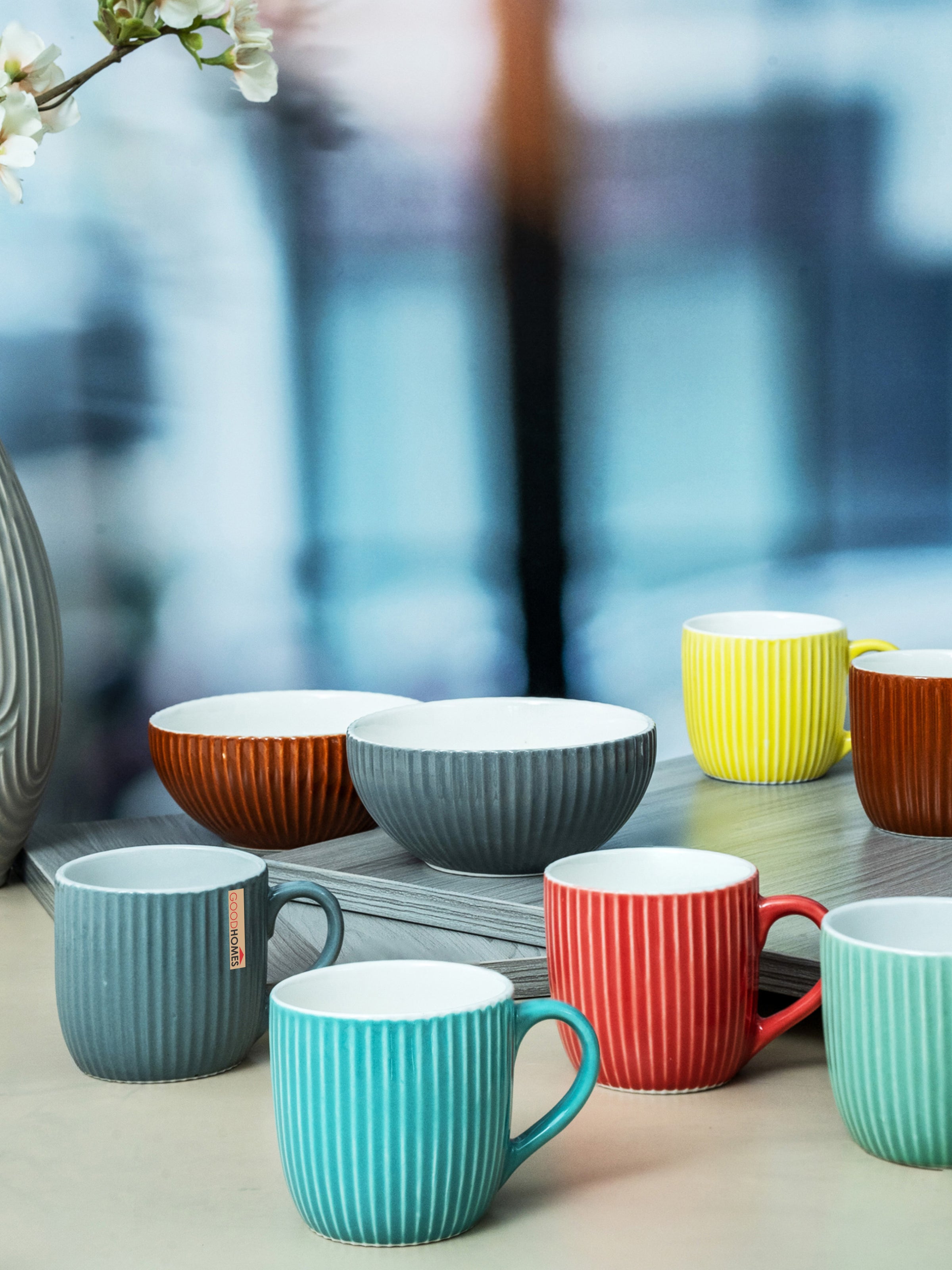 Brighten up your coffee moments with this vibrant porcelain set featuring six embossed coffee mugs in different colors and two matching snack bowls. Stylish, practical, and beautifully coordinated, it makes a perfect gift for any occasion. 2pcs Serving Bowl : H-5.5cm, R-12.0cm, W-234gm, C-300ml, 6pcs Mug : H-6.8cm, L-7.0cm, W-10.0cm, W-160gm, C-180ml)