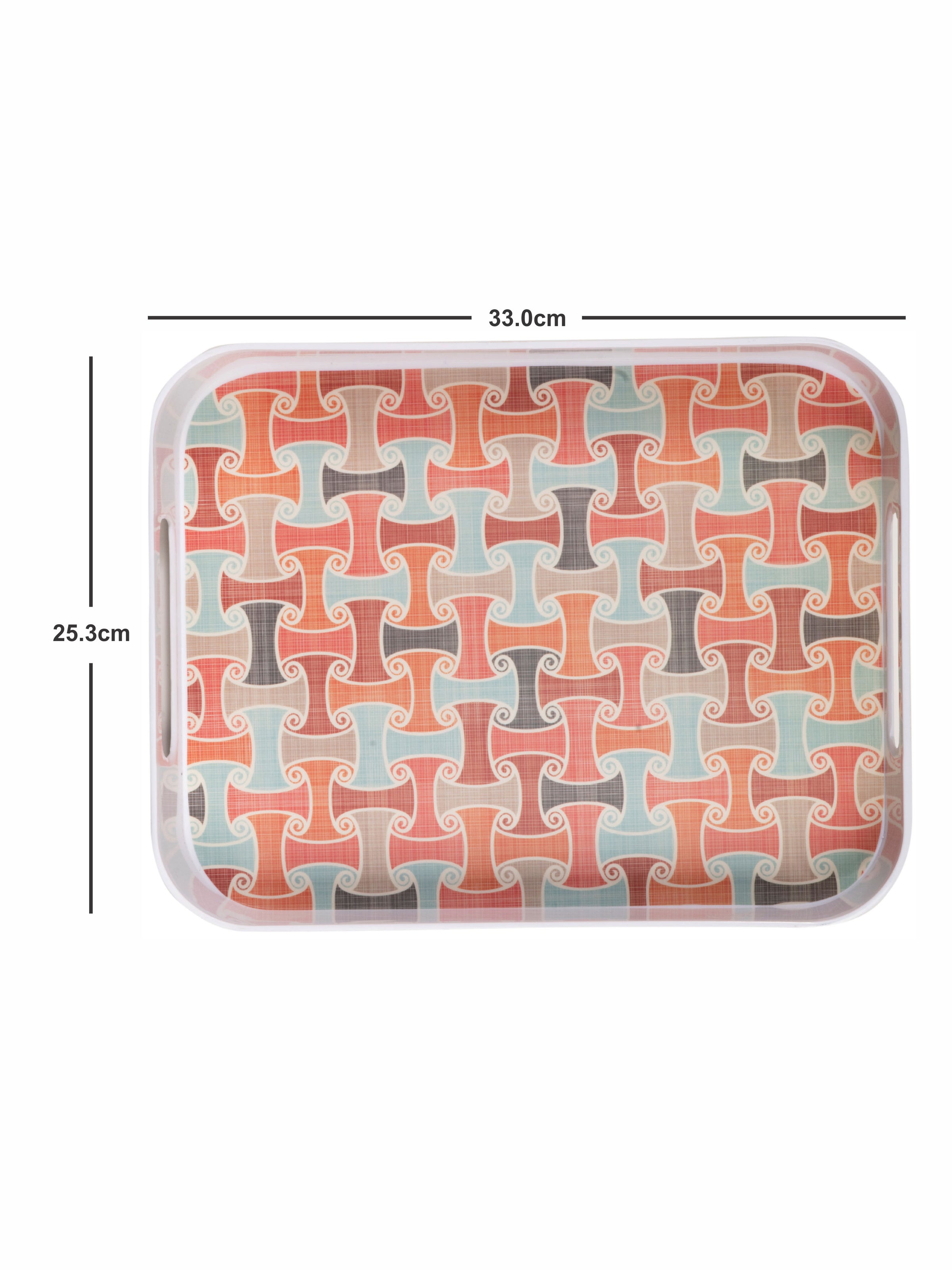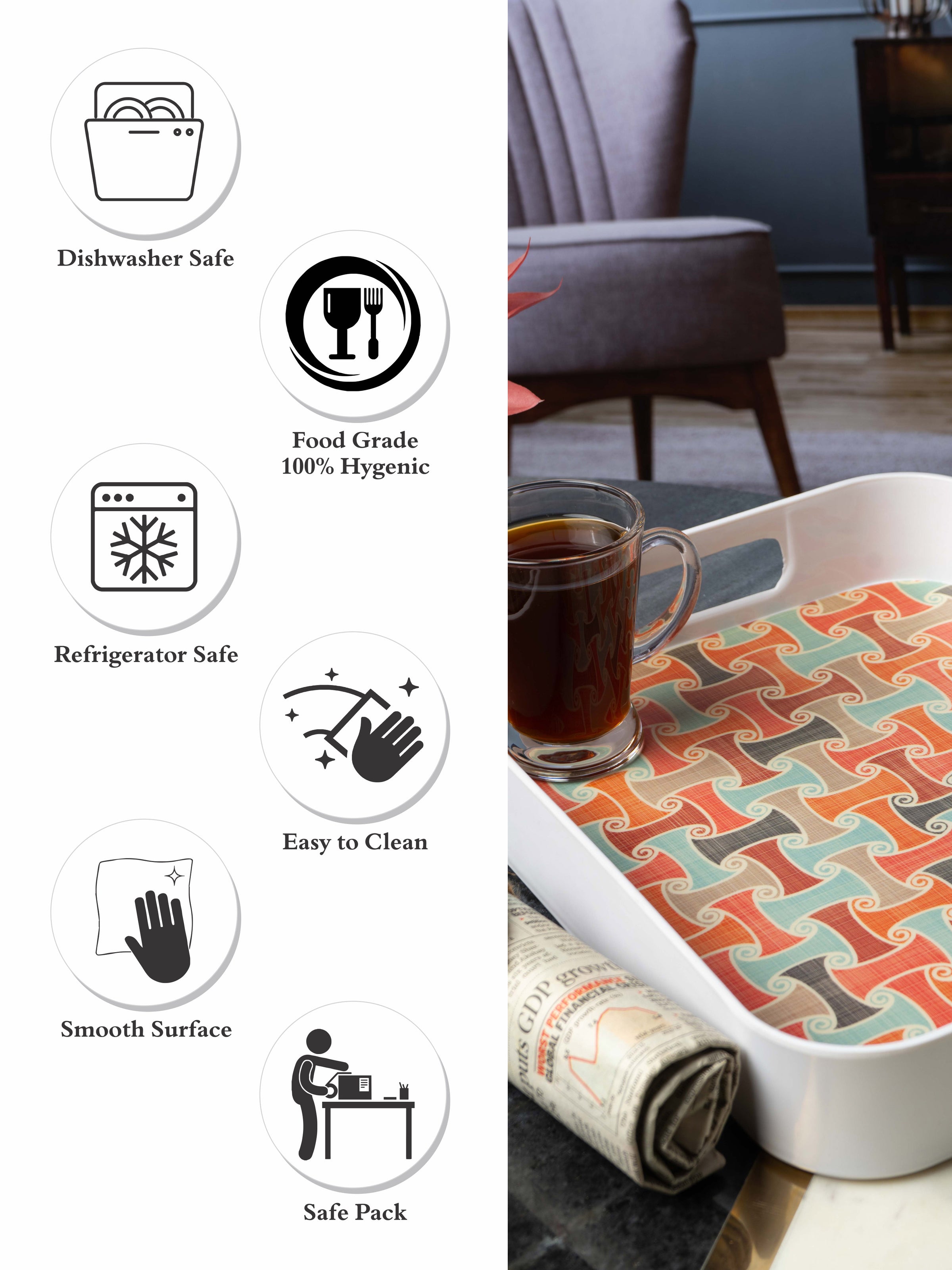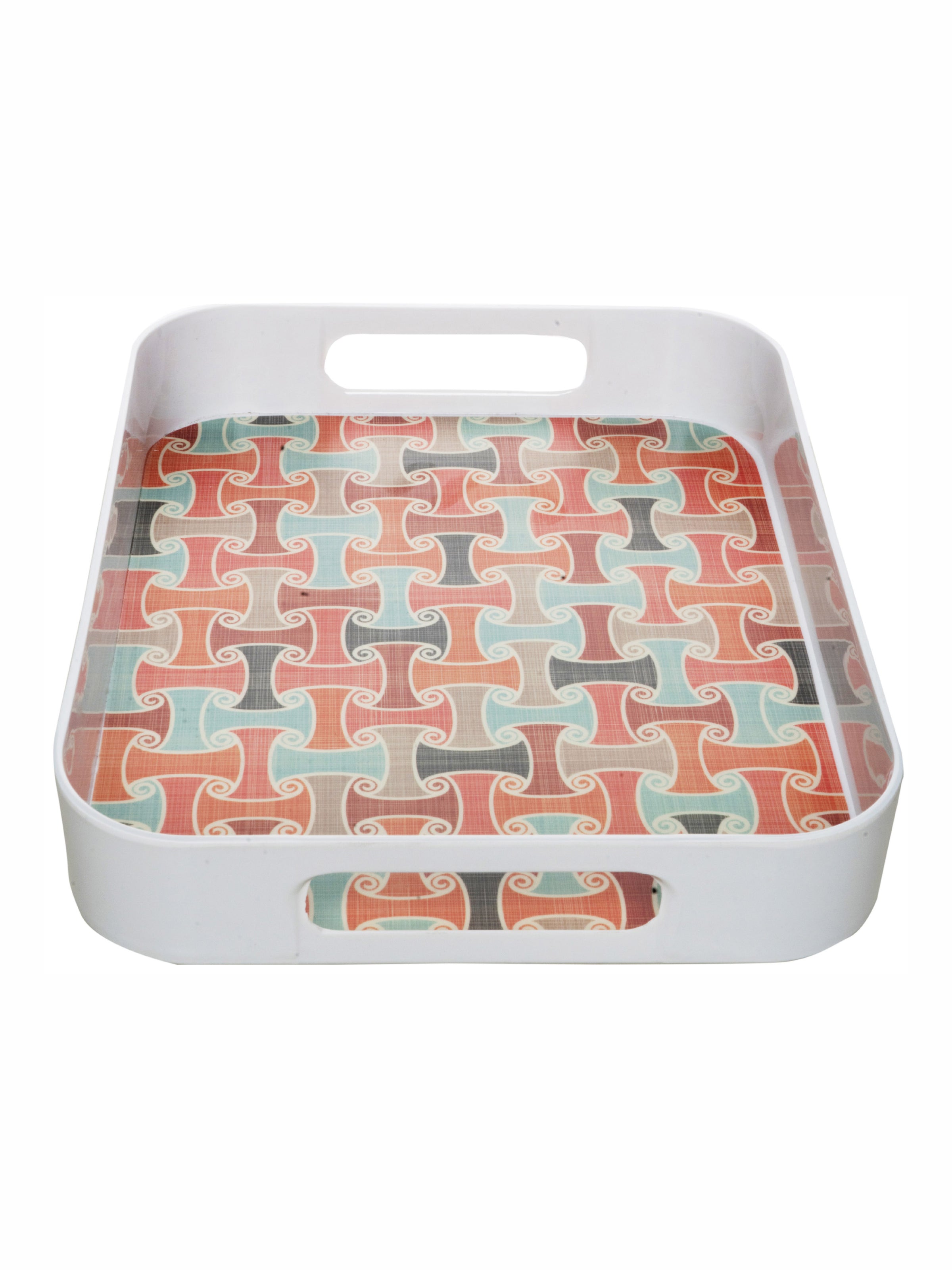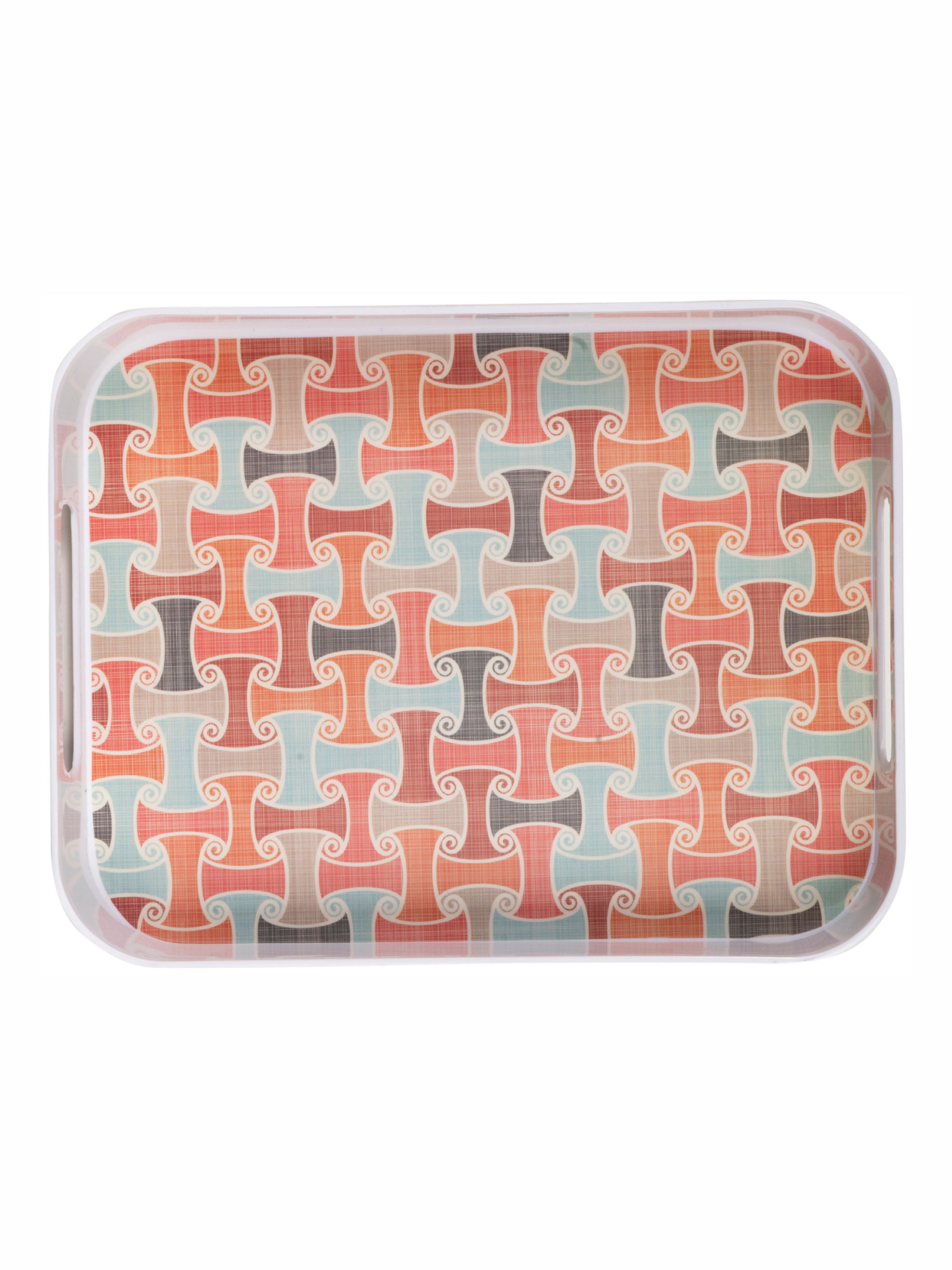 This beautiful rectangular printed Melamine tray with easy-to-grip handles is a practical yet stylish addition to any kitchen and adds a chic element to serving a variety of things. Use this contemporary tray to serve a leisurely breakfast, after-dinner drinks or to bring lunch outdoors on a sunny afternoon. With so many serving options, this durable and easy to clean tray offers a handy yet modern element to any kitchen and will be a great addition to your serving ware.