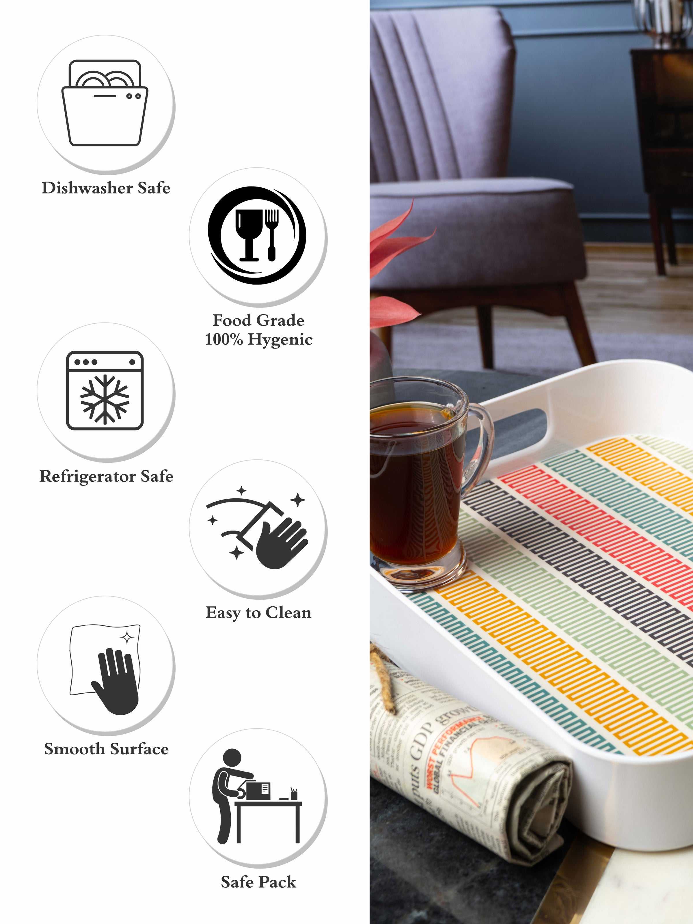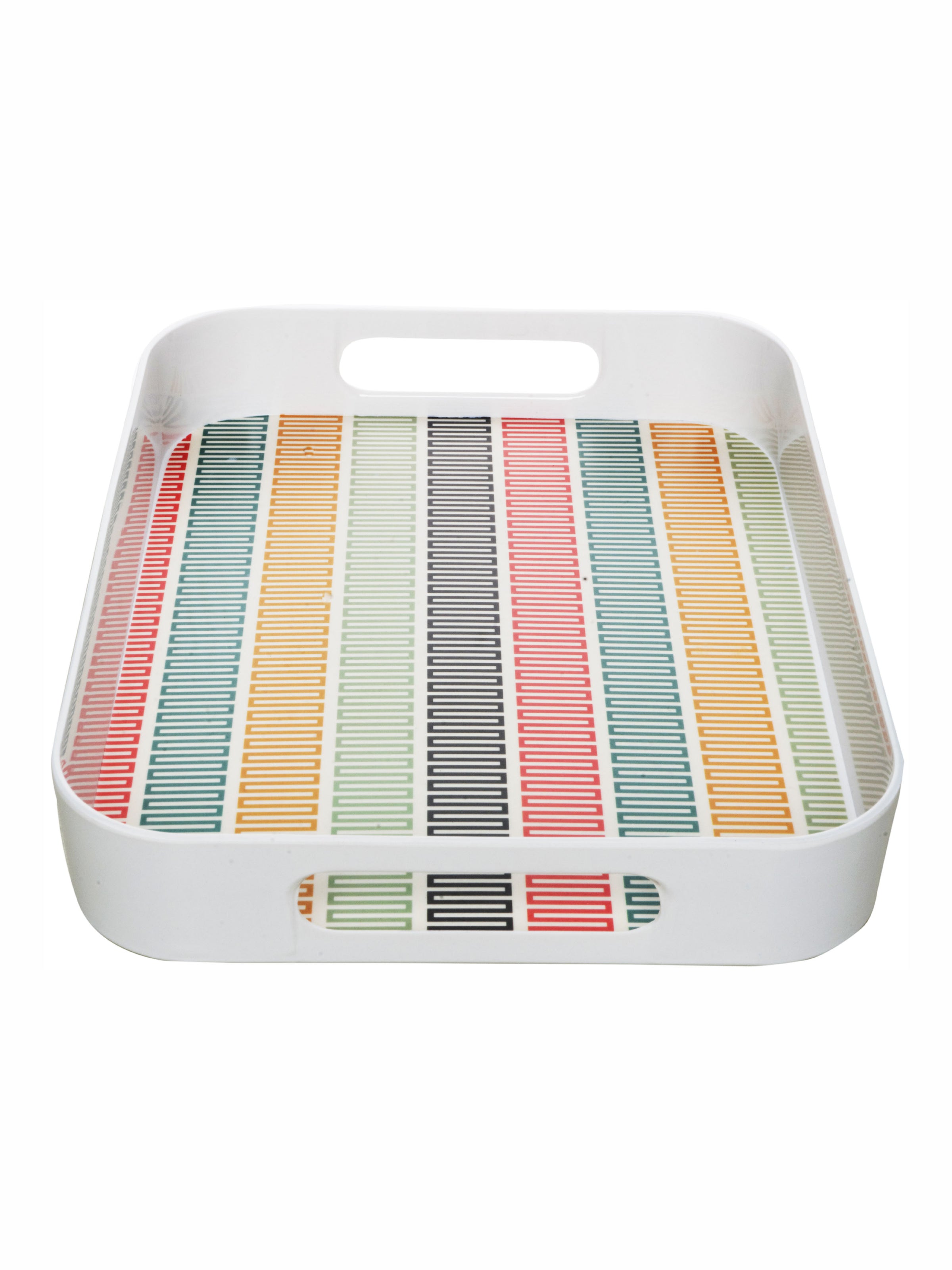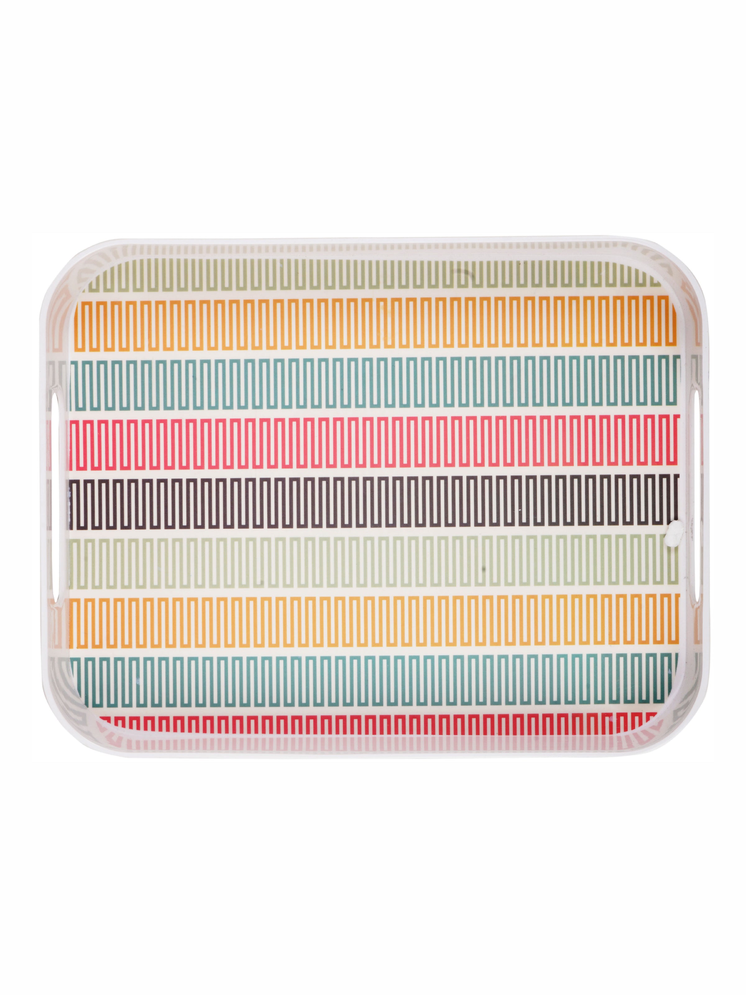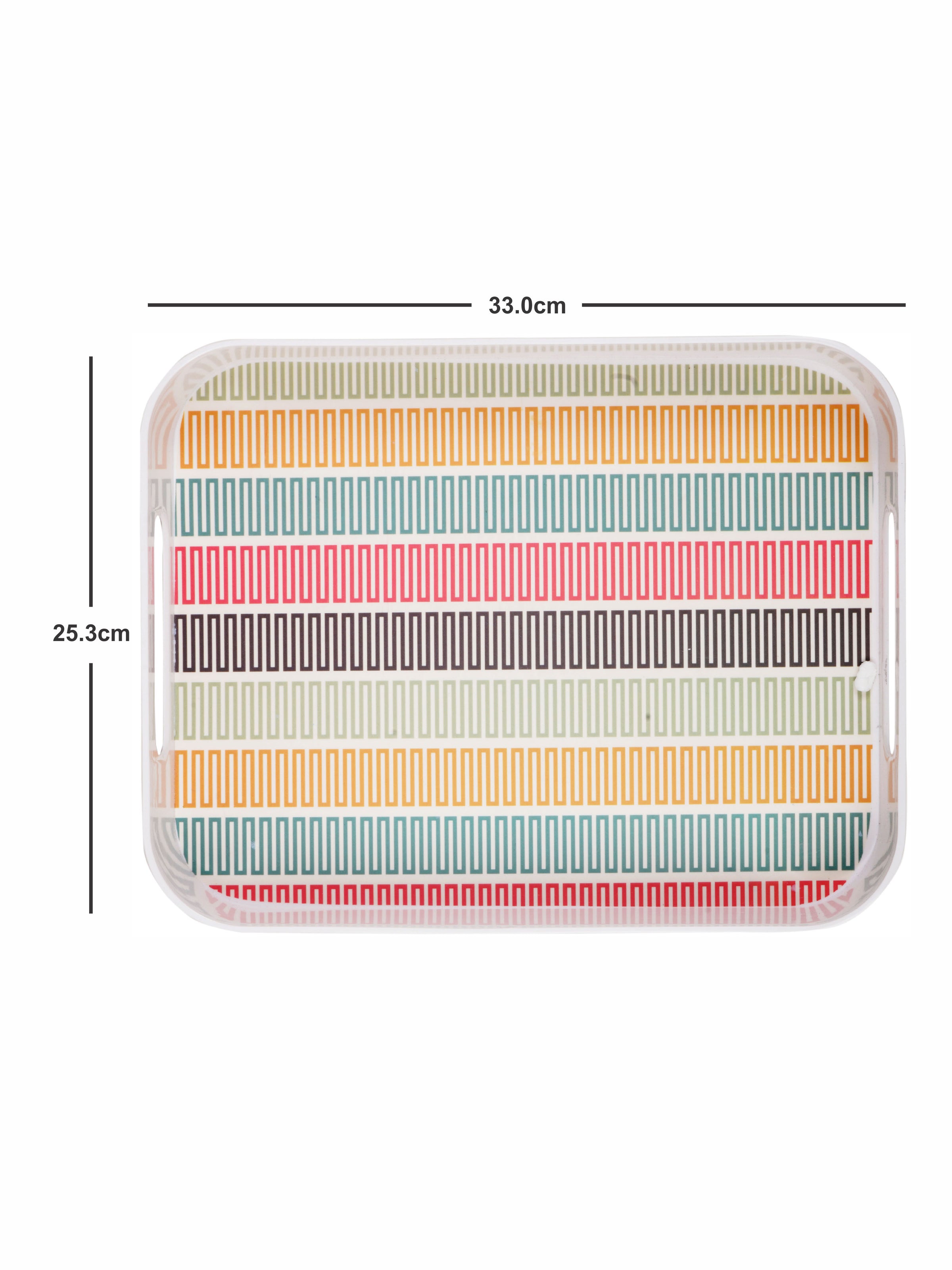 This beautiful rectangular printed Melamine tray with easy-to-grip handles is a practical yet stylish addition to any kitchen and adds a chic element to serving a variety of things. Use this contemporary tray to serve a leisurely breakfast, after-dinner drinks or to bring lunch outdoors on a sunny afternoon. With so many serving options, this durable and easy to clean tray offers a handy yet modern element to any kitchen and will be a great addition to your serving ware.