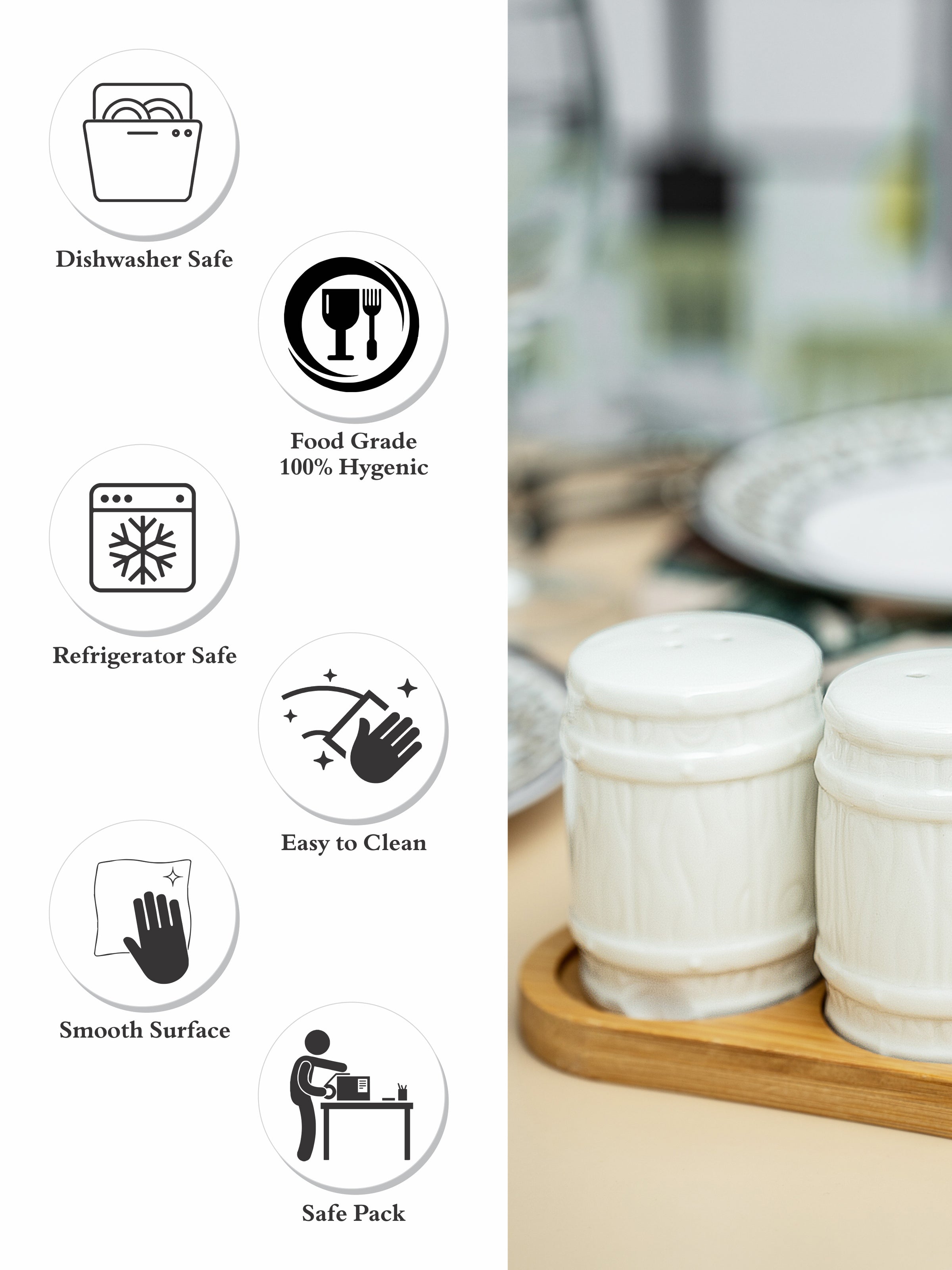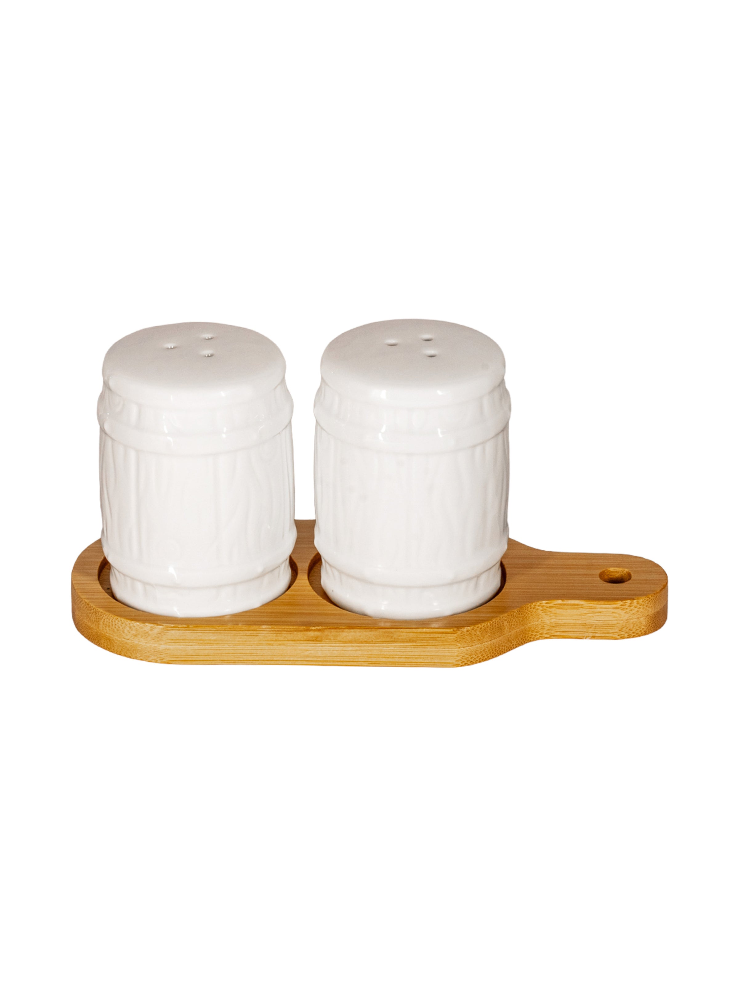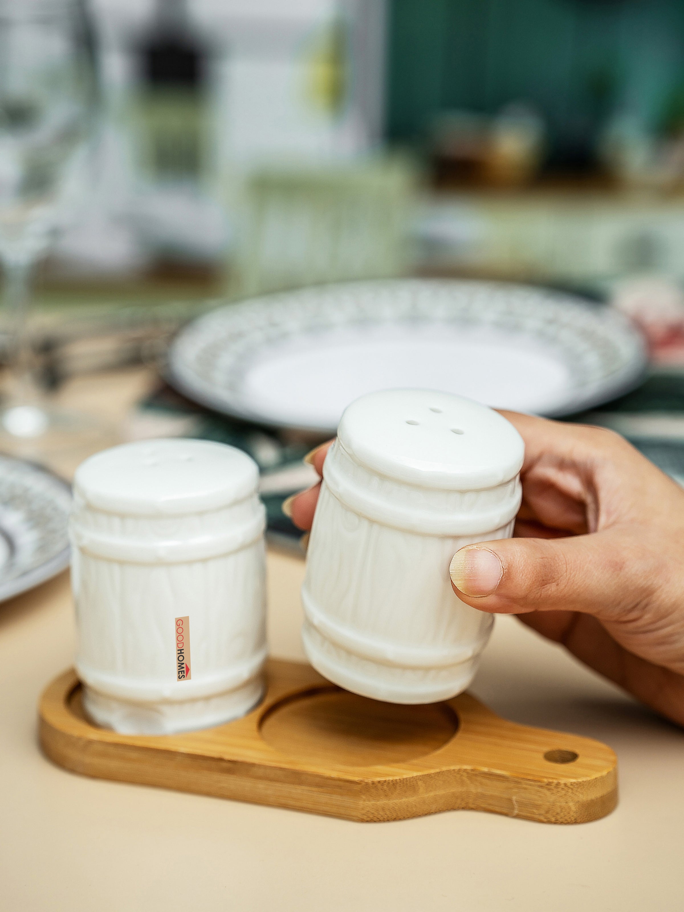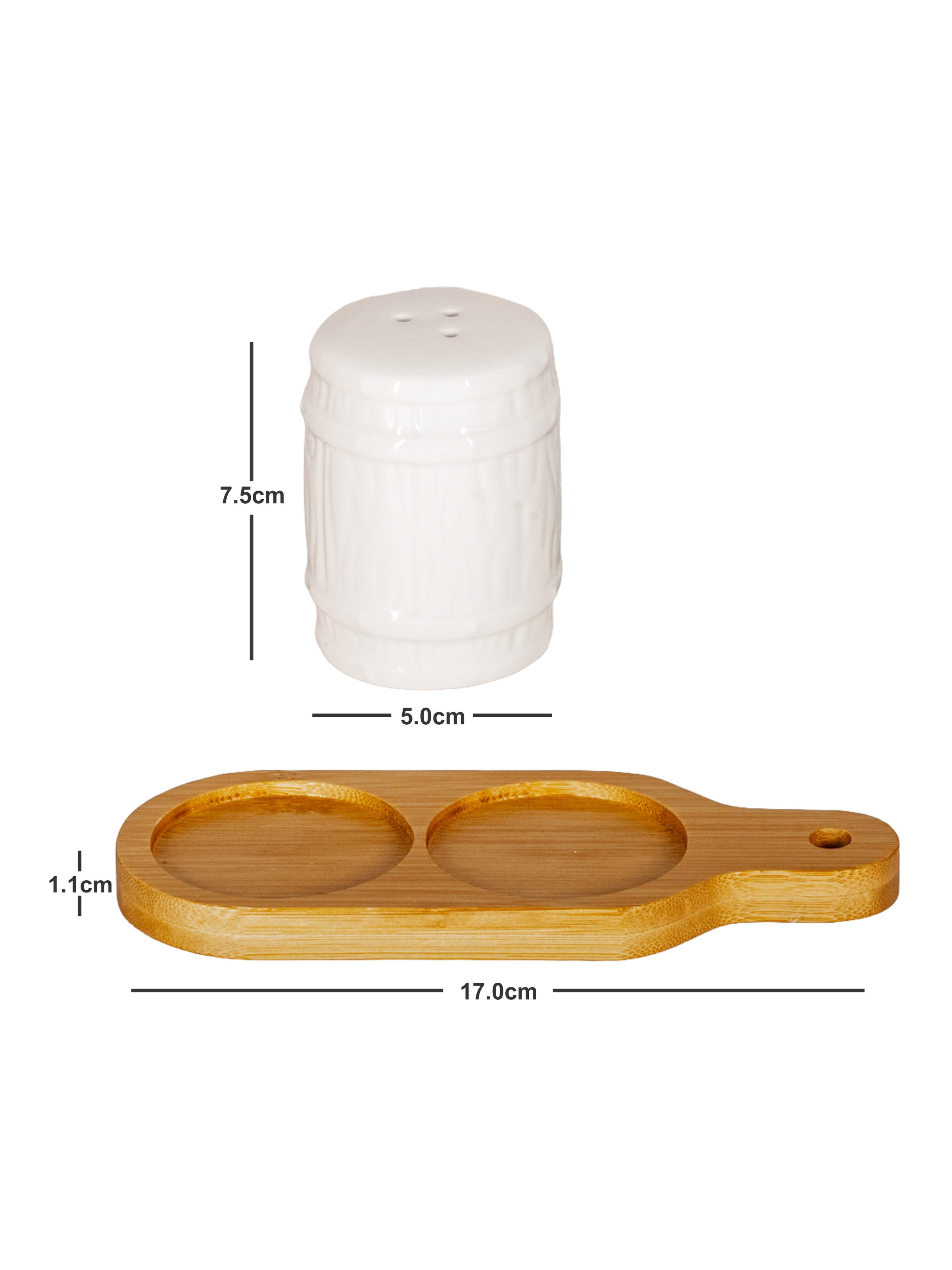 Add a touch of elegance to your table with this porcelain salt and pepper shaker set, beautifully paired with a natural wooden stand. The smooth porcelain finish complements the warm wood base, making it both a functional and stylish dining accessory. (2pcs Salt & Pepper : H-7.5cm, R-5.0cm, W-100gm, C-30ml, Tray : H-1.1cm, L-6.7cm, W-17.0cm, W-64gm)