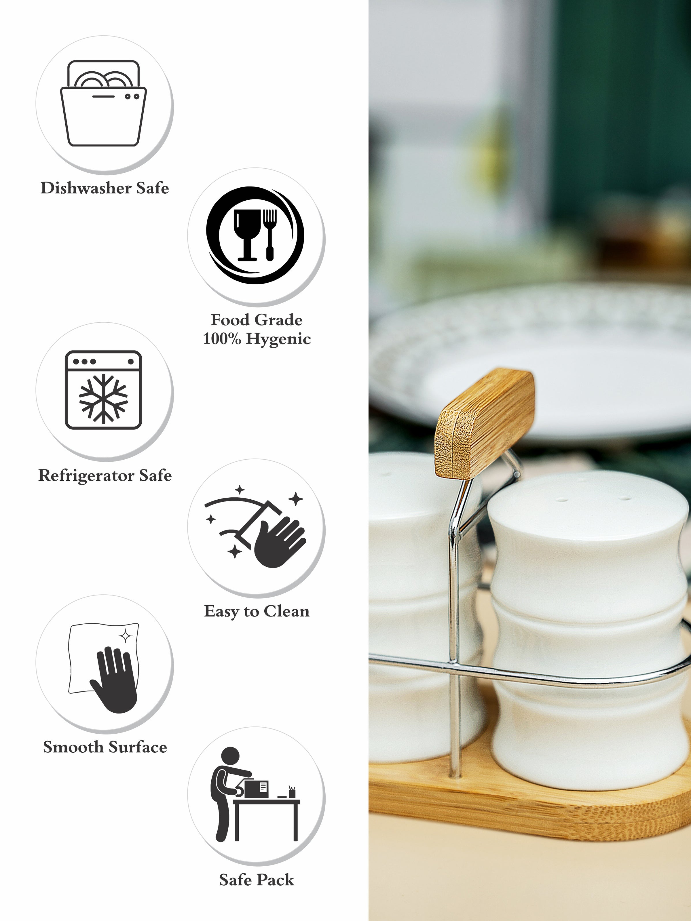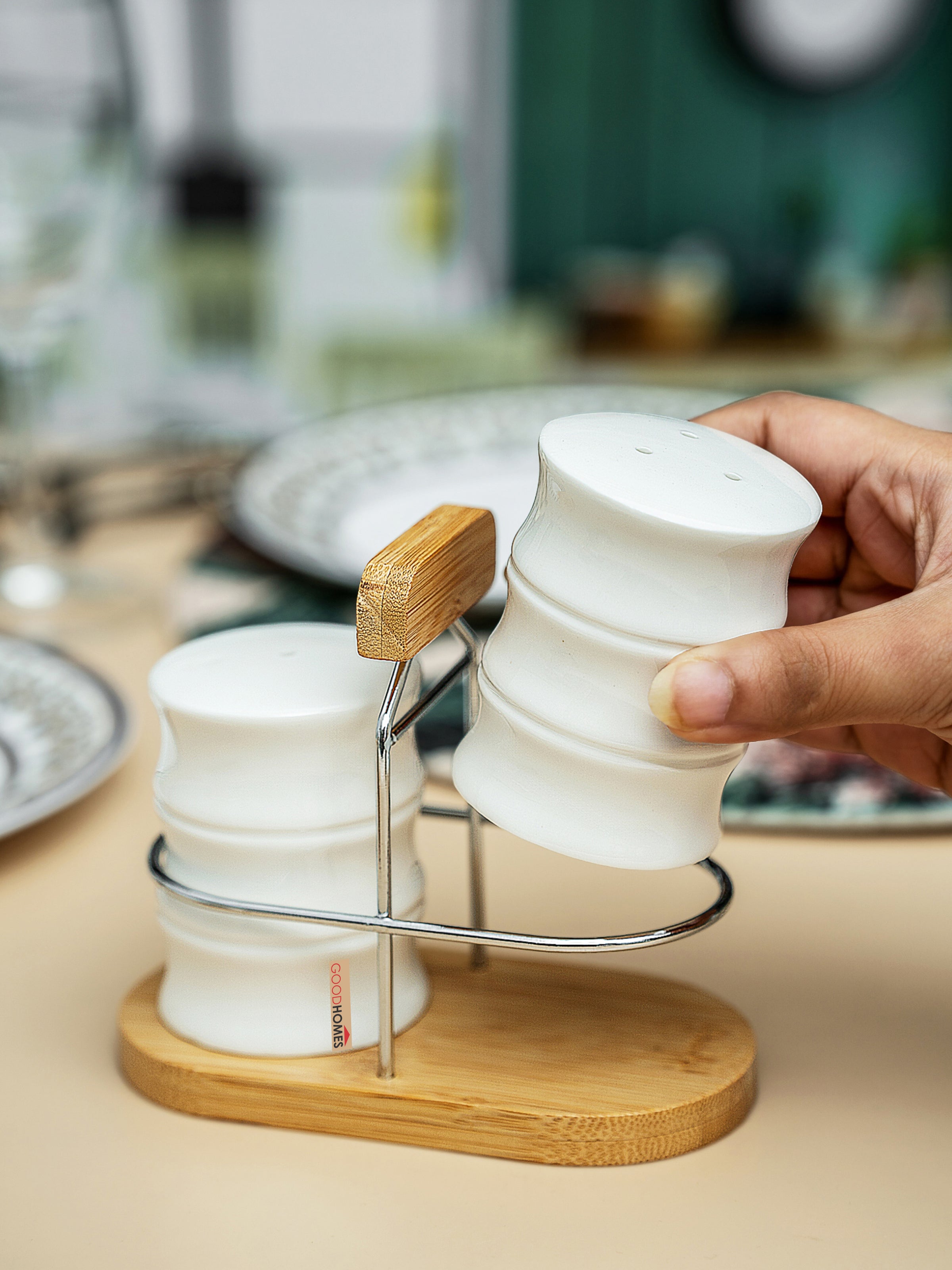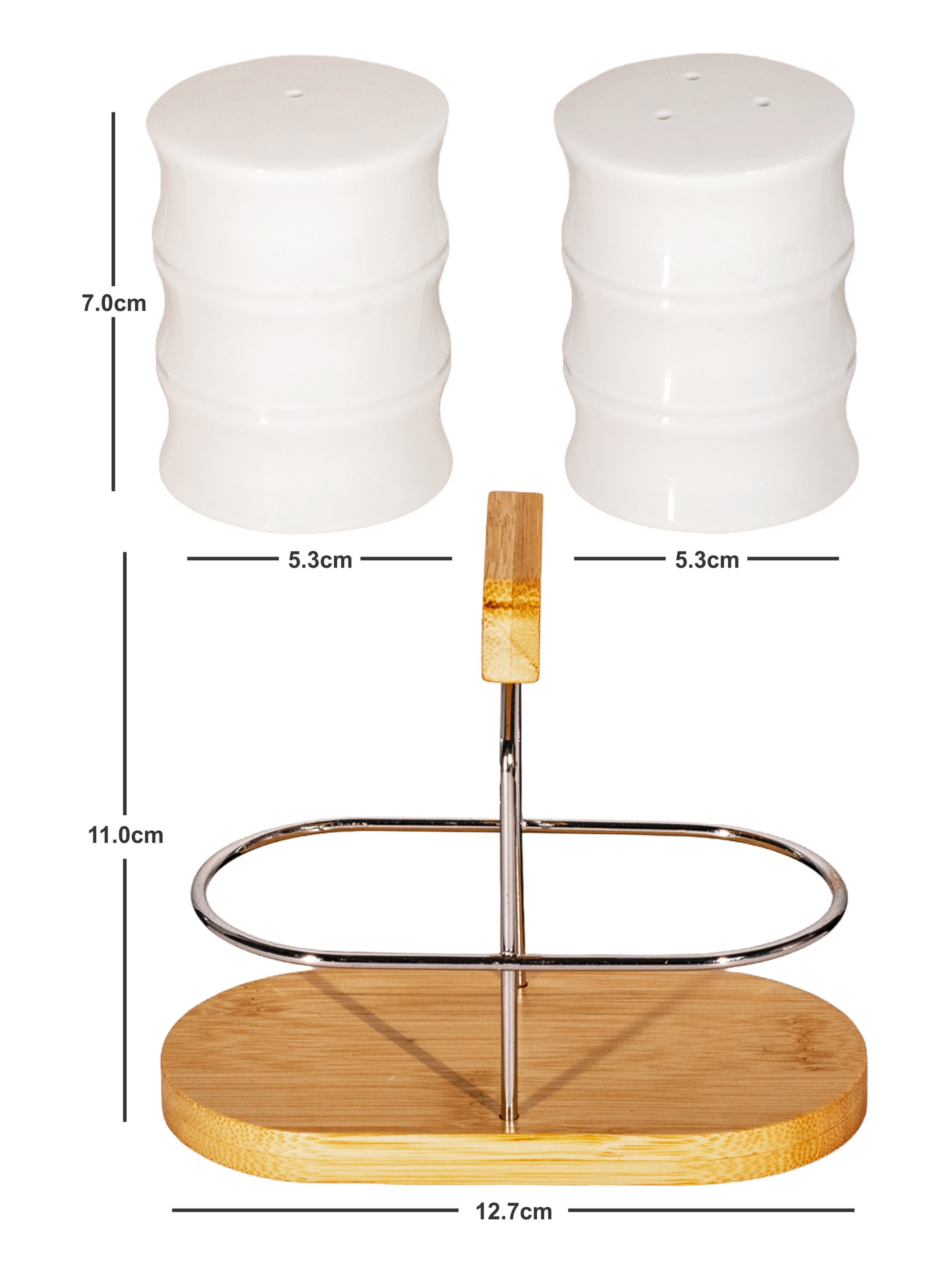 Add a touch of elegance to your table with this porcelain salt and pepper shaker set, beautifully paired with a natural wooden stand. The smooth porcelain finish complements the warm wood base, making it both a functional and stylish dining accessory. (2pcs Salt & Pepper : H-7.0cm, R-5.3cm, W-96gm, C-35ml, Stand : H-11.0cm, L-6.7cm, W-12.7cm, W-92gm)