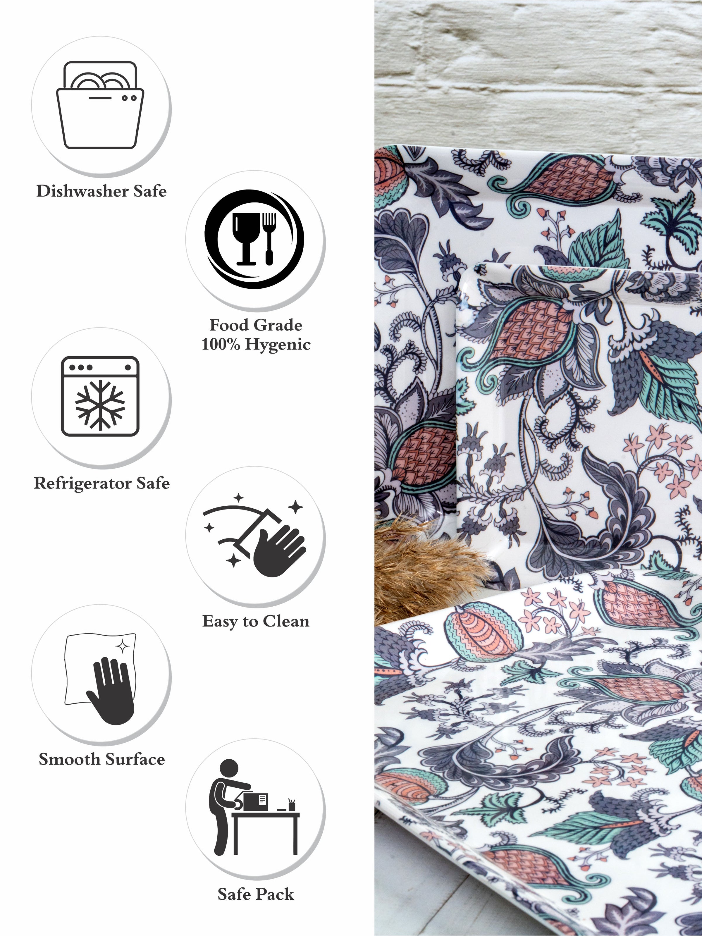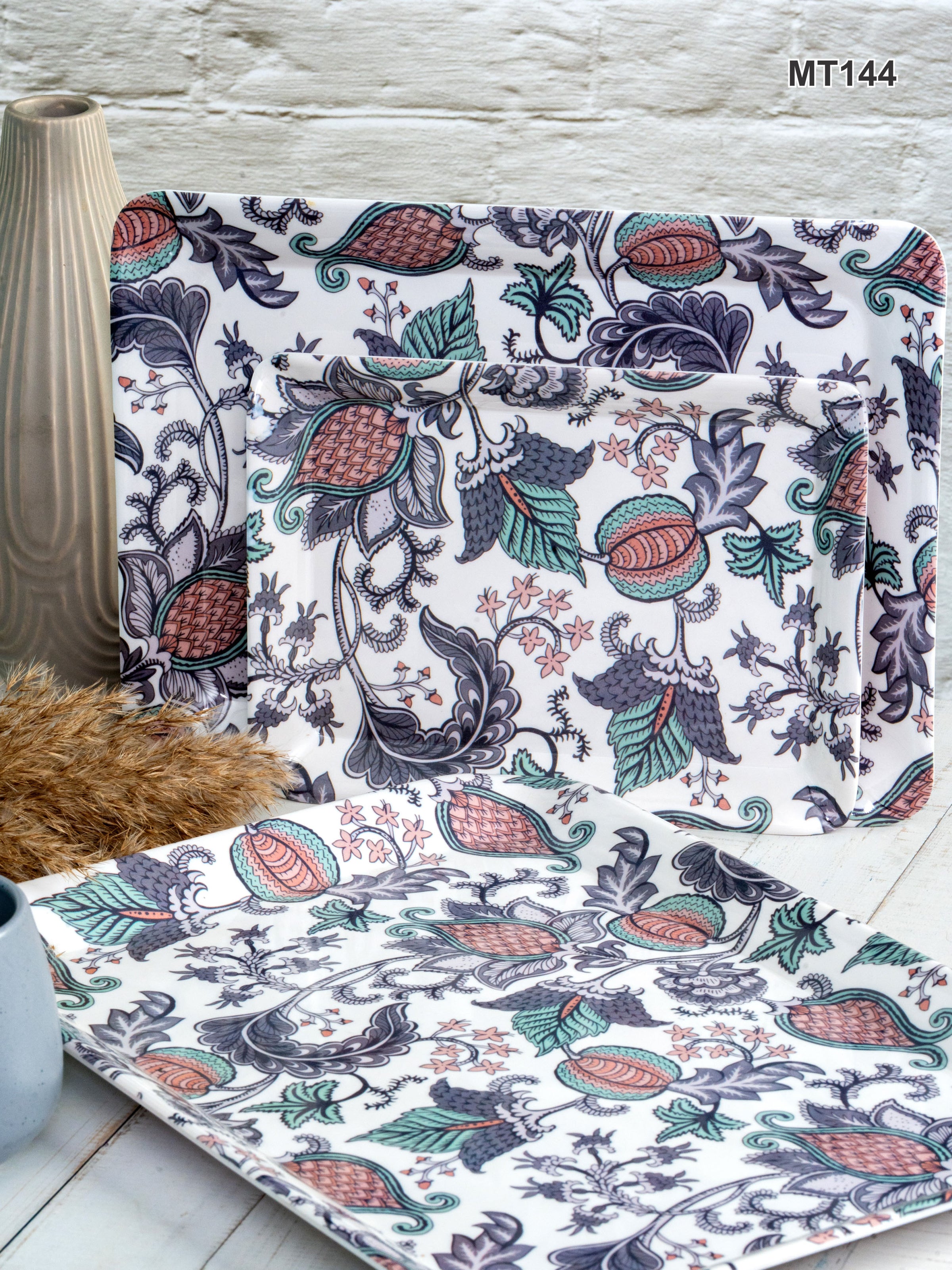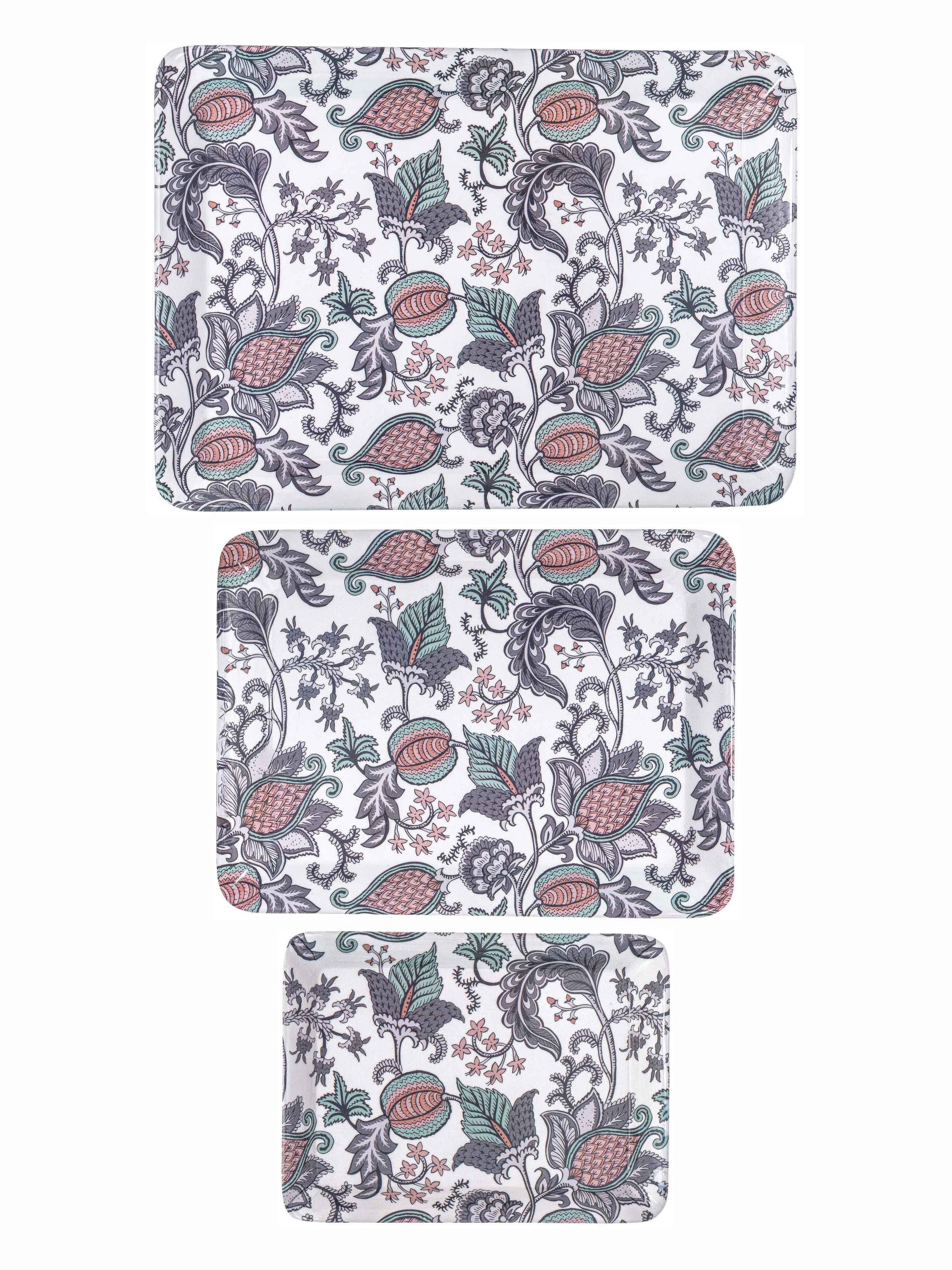 Brighten up your kitchenware with the vibrant and artistic design of this melamine tray set, featuring a beautiful pattern that is sure to catch the attention of your guests. Made from durable melamine for long lasting wear and a light weight feel, this tray set is an excellent addition to your home. Small : 2.0cm X 17.0cm X 23.0cm, Medium : 2.2cm X 23.0cm X 31.0cm, Large : 2.0cm X 27.5cm X 38.0cm