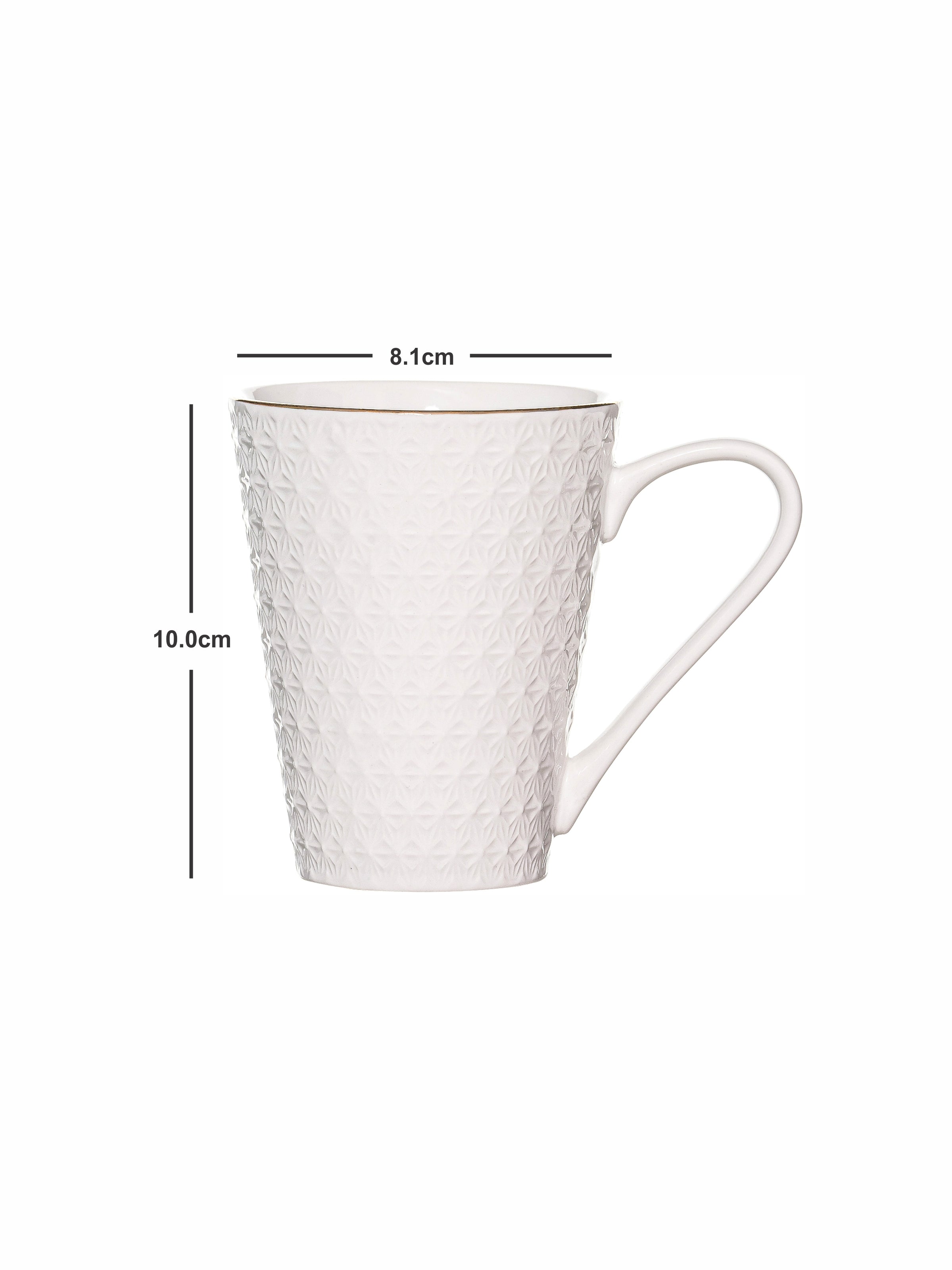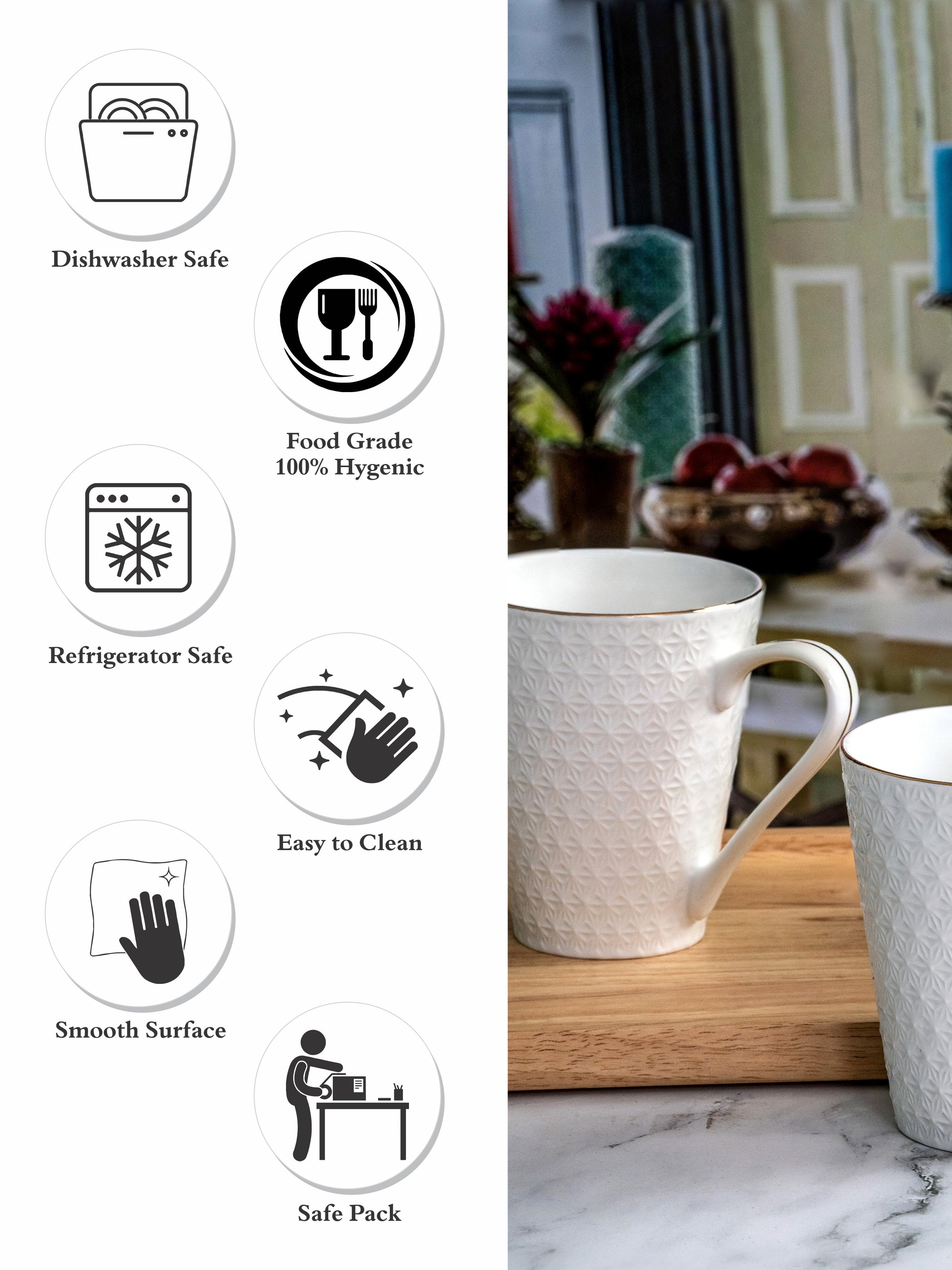 Bringing glamour to coffee mornings or afternoon teas, this fine porcelain coffee mug set is decorated with 24k gold print. This versatile embossed design is simple and classic, making it the perfect choice for any home and also for gifting. Impress your guests with these beautifully designed mugs.