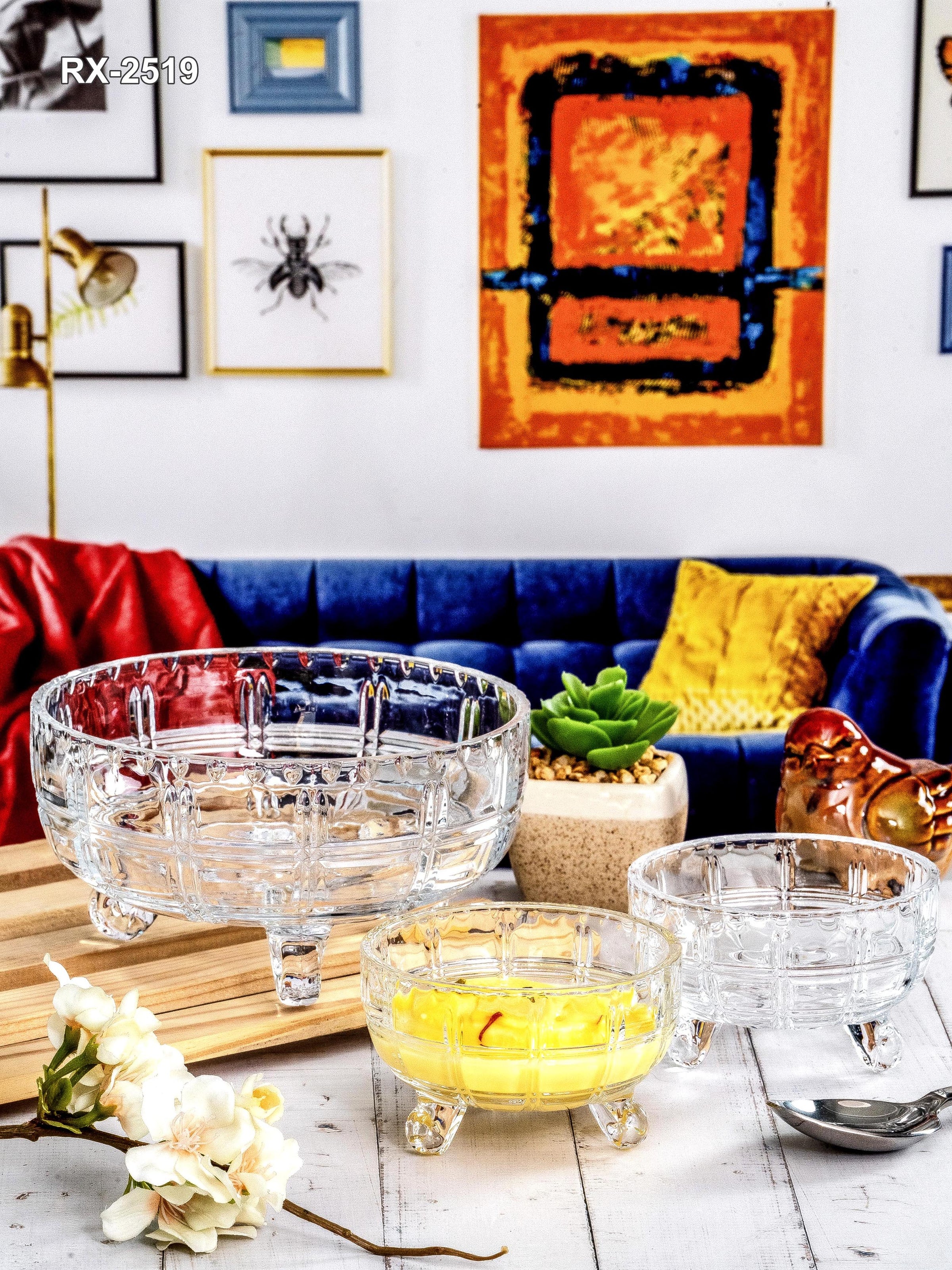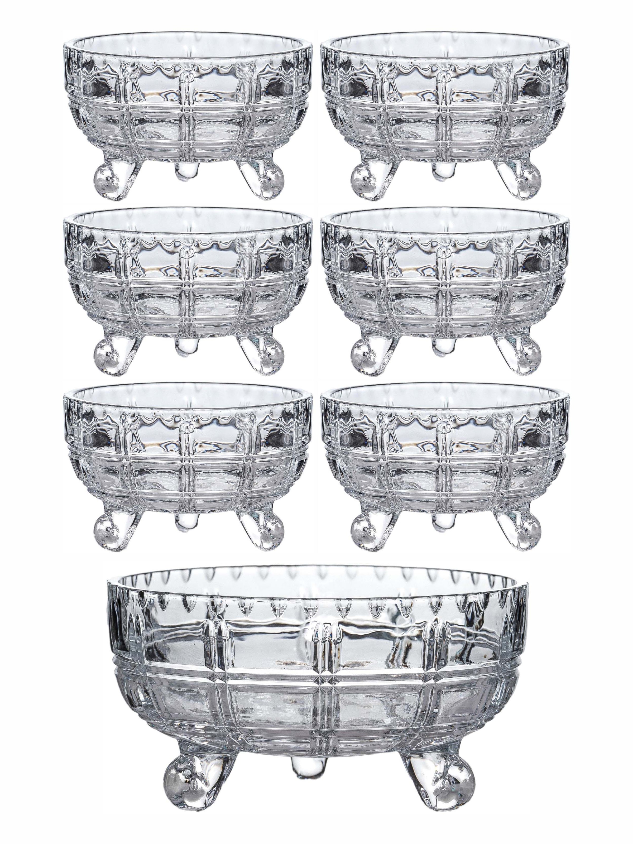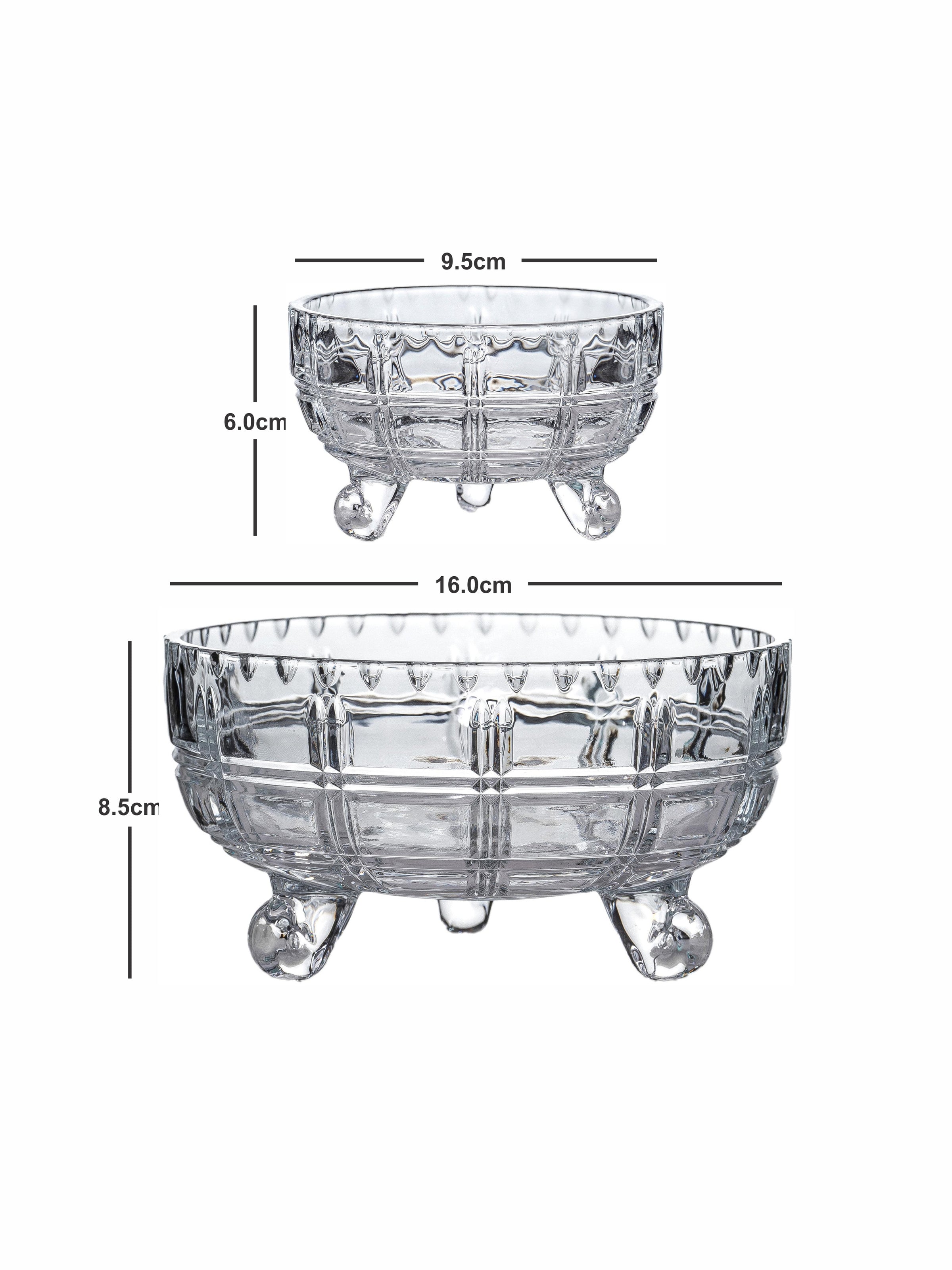 Freshen up your crockery with this stylish glass bowl set in crystal cut design. This bowl set comprising of a serving bowl and 6 small bowls is a versatile item, making it suitable for desserts, nibbles or anything you like. It is perfect for bringing charm to your dinner table and blends effortlessly with your existing tableware. It is very easy to clean as the crystal cut design is on the outer surface of the bowls. (Ser. Bowl : H-8.5cm, Round-16.0cm, W-646gm, C-830ml, Des. Bowl : H-6.0cm, Round-9.5cm, W-196gm, C-180ml)
