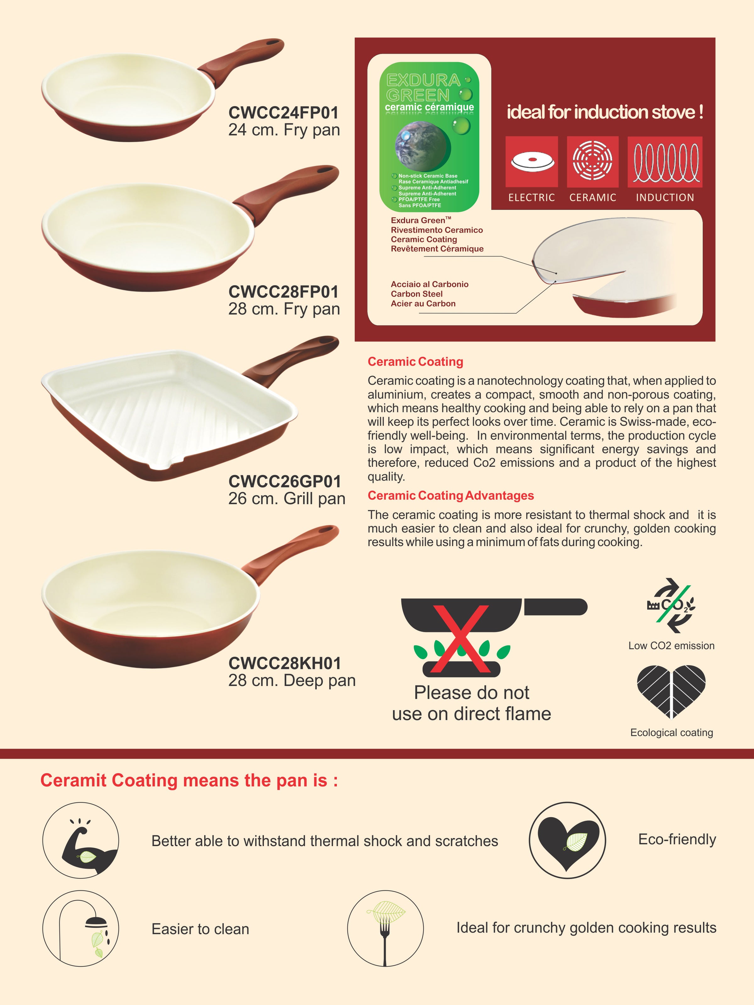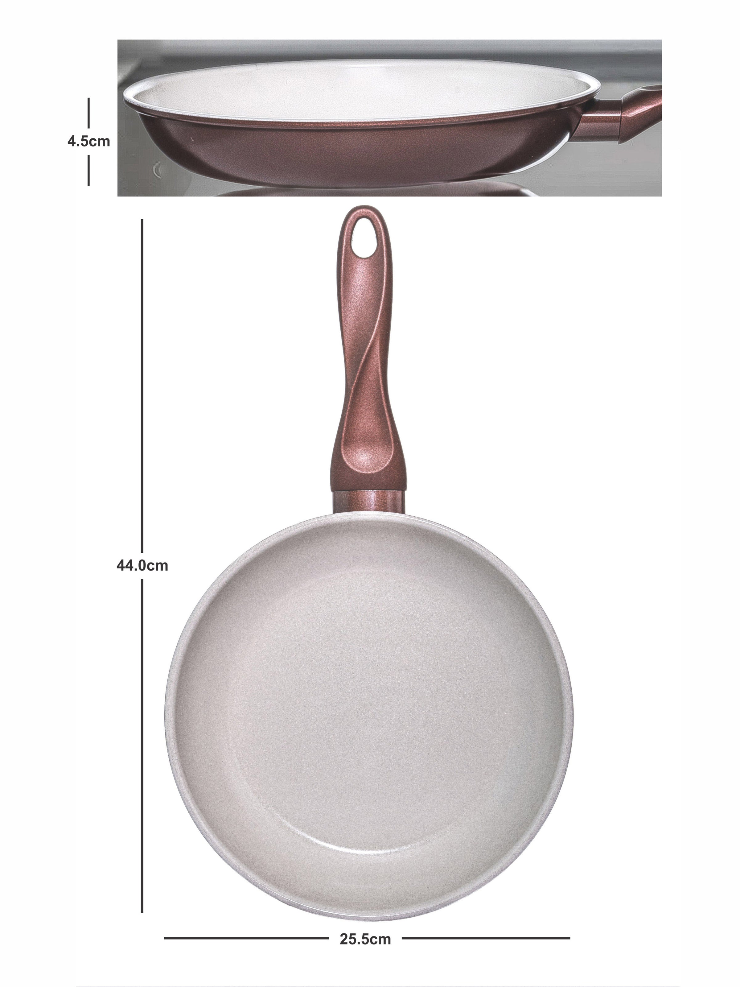 The Fry Pan with a Ceramic coating which is a nanotechnology coating that, this Fry pan have triply material like Stainless Steel applied to aluminum, creates a compact, smooth and non-porous coating, which means healthy cooking and being able to rely on a pan that will keep its perfect looks over time. The ceramic coating is more resistant to thermal shock. It is much easier to clean and also ideal for crunchy, golden cooking results while using a minimum of fats during cooking. The product is not suggested not to be used on High Flame.