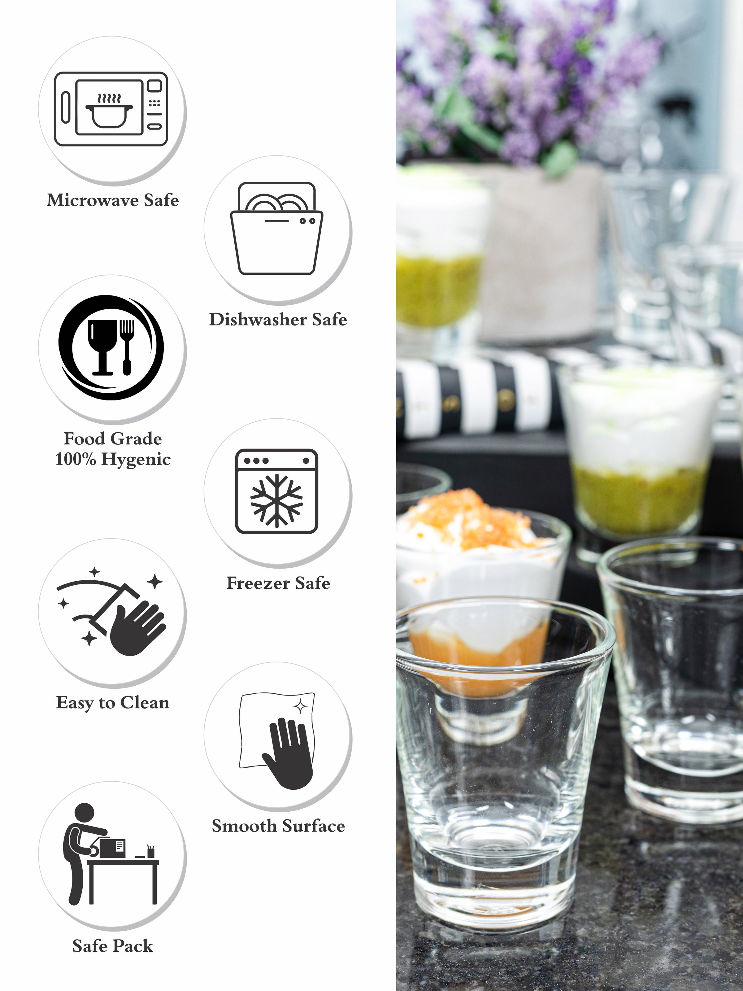 Perfectly suited for parties, this shot glasses set is a novel way to serve starters or desserts to your guests. You can also use these glasses to serve liquor shots. Whether you are entertaining indoors or outdoors, this set is sure to be the focal point of the party. The contemporary design of these glasses makes it ideal for any occasion.