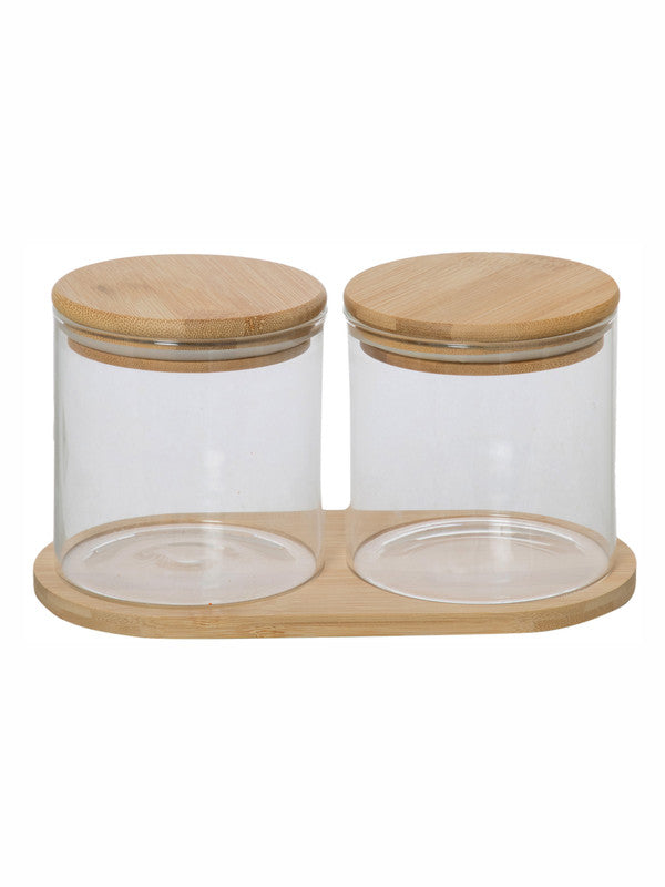 Goodhomes Glass Storage Jar with Wooden Lid & Tray (Set of 2pcs Jar & 1pc Tray)