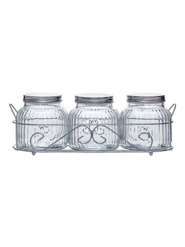Goodhomes Glass Storage Jar with Metal Lid & Stand (Set of 3pcs Jar & 1pc Stand)