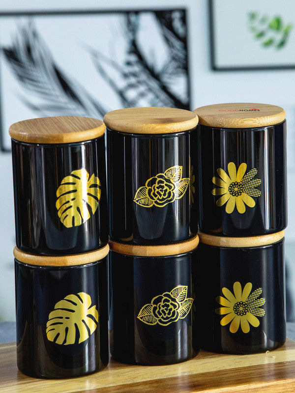 Goodhomes Glass Storage Jar with Wooden Lid & Gold Print (Set of 6pcs)