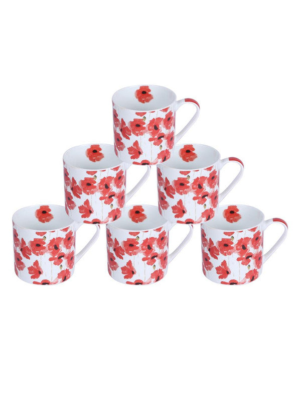 Bone China Coffee Mug Set with Red Flower Design. ( Set of 6 Cup )