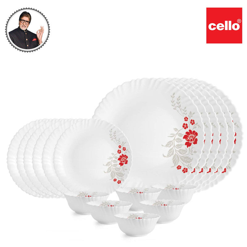 Cello Dazzle Scarlet Bliss Opalware Dinner Set, 18 Pieces, White
