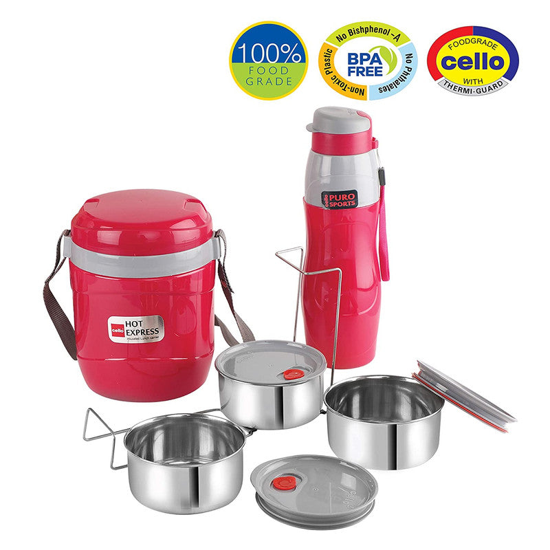 Cello Lunch Express, Insulated Plastic Tiffin and Water Bottle- Red