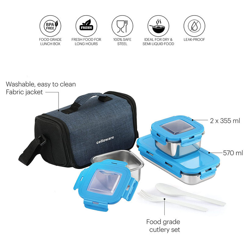 Cello Max Fresh Foodzone Lunch Box, 355mlx2 + 570mlx1 and Jacket, Blue