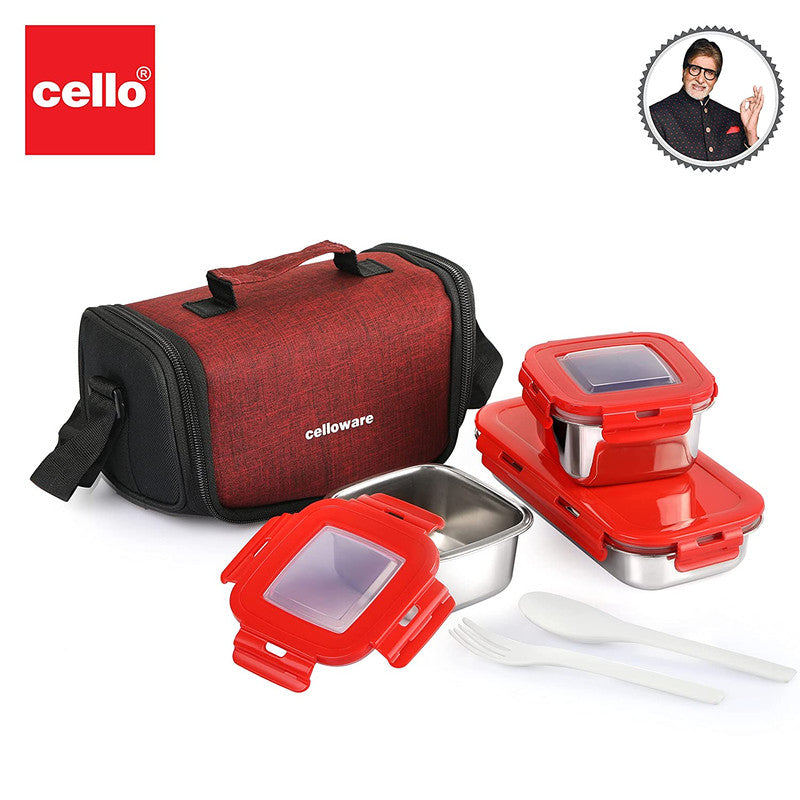 Cello Max Fresh Foodzone Lunch Box, 355mlx2 + 570mlx1 and Jacket, Red