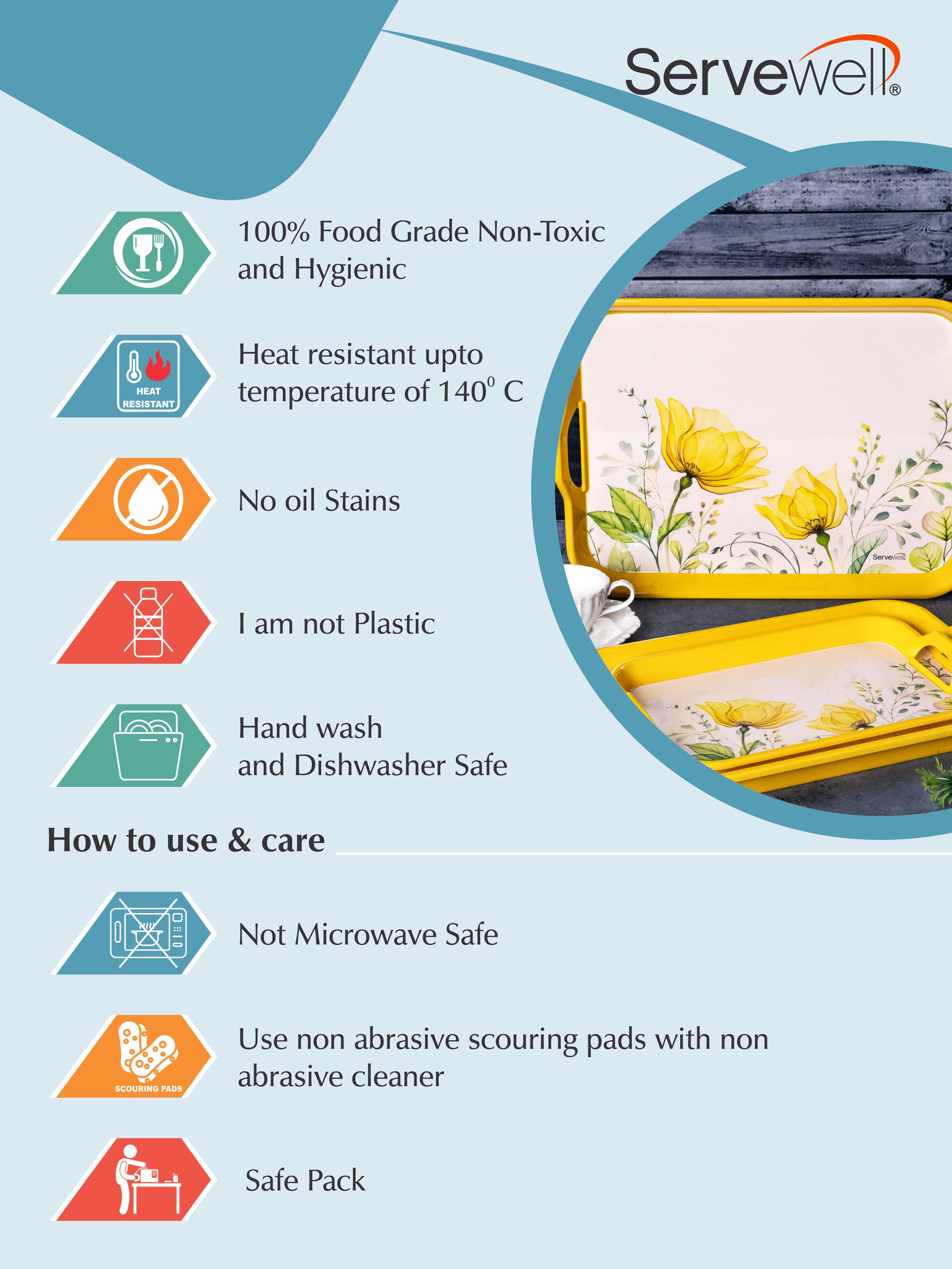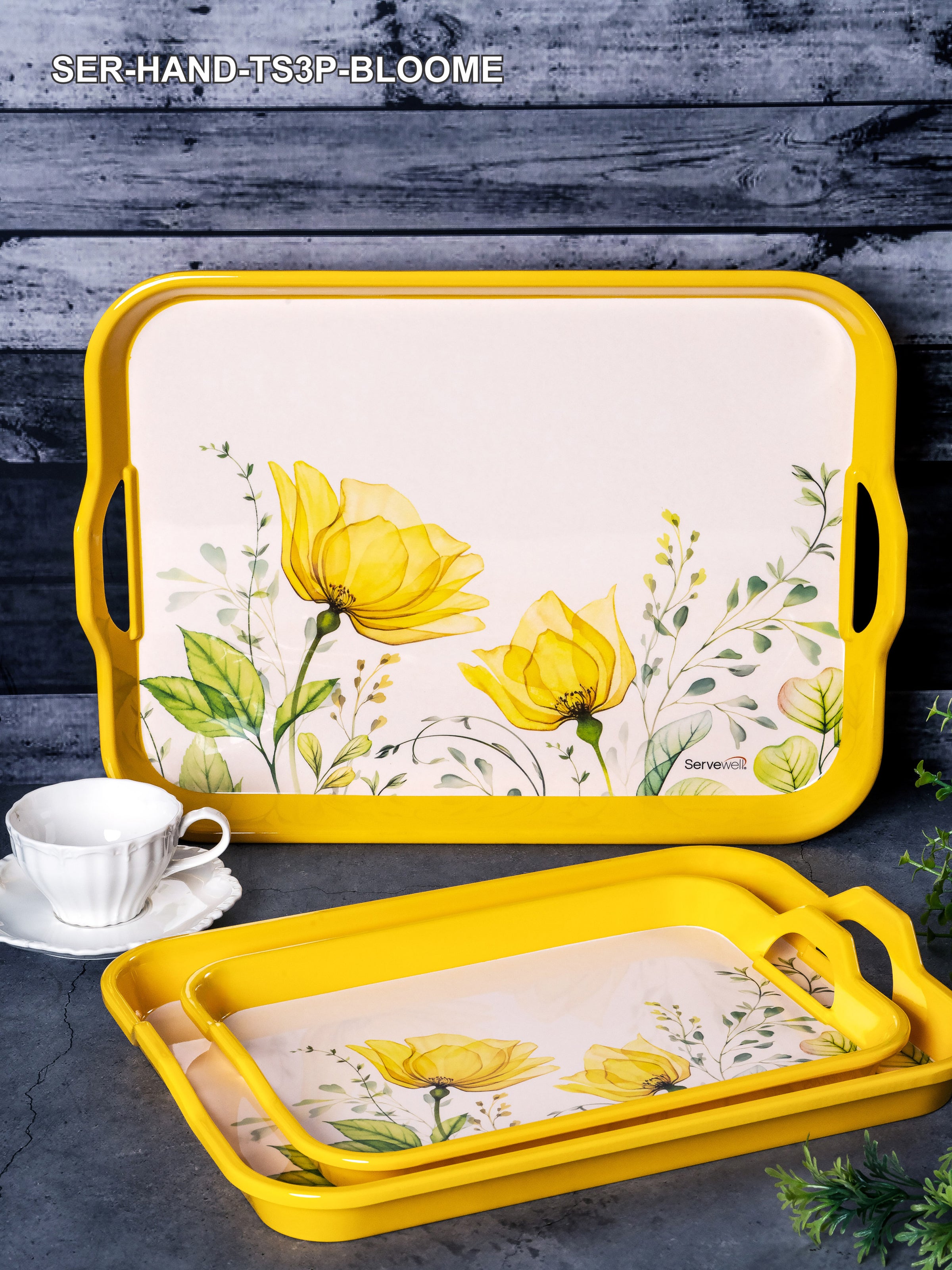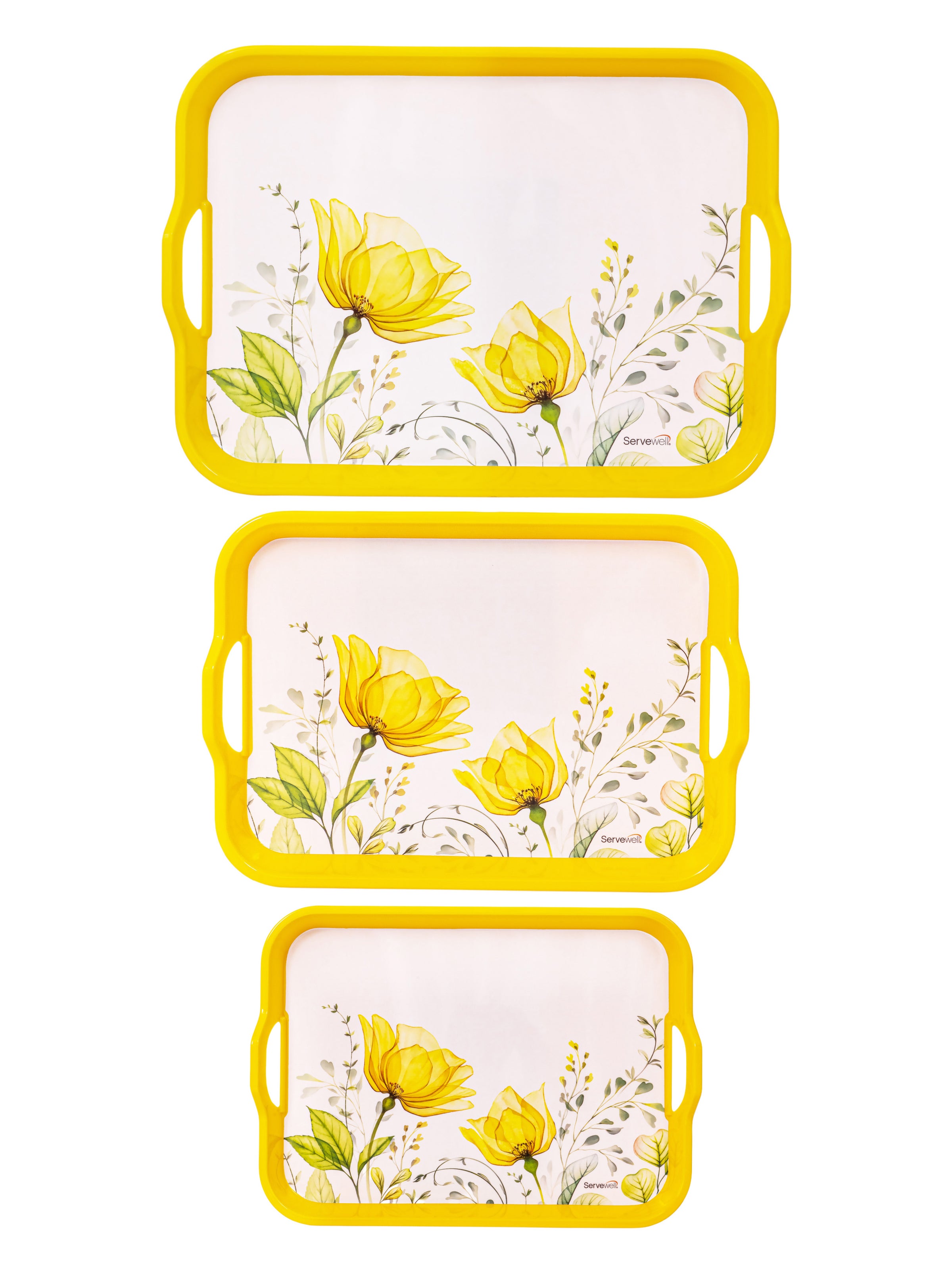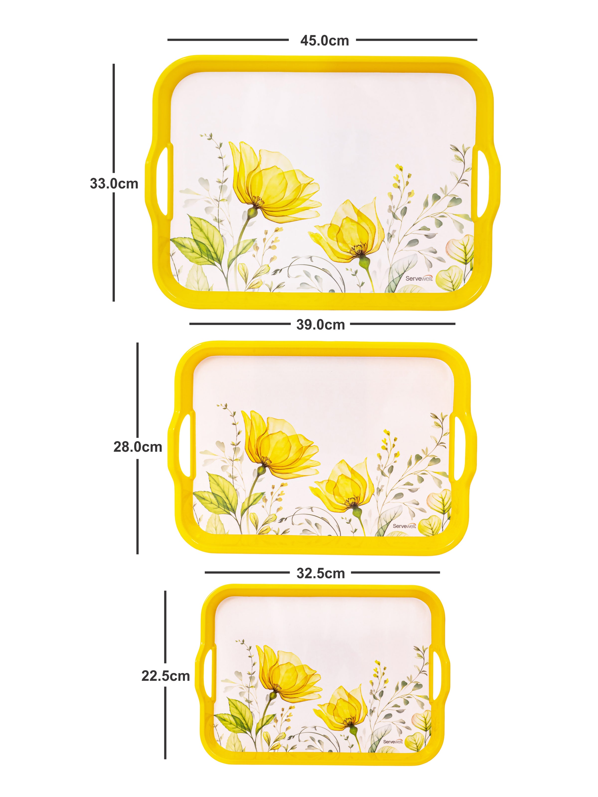 Serve in style with this elegant Full Body Colored Melamine 3 Piece Tray Set, featuring durable, fine finish and a complimenting printed design that adds a touch of charm to every table. Perfect for daily use or special occasions — lightweight, easy to clean, and built to last. (1pc Tray Small - L-22.5cm,W-32.5cm, H-4.0cm, W-296gm, 1pc Tray Medium - L-28.0cm, W-39.0cm, H-4.8cm, W-546gm, 1Pc Tray Large - L-33.0cm,W-45.0cm, H-4.8cm, W-686gm)