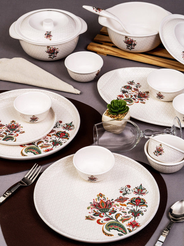 Perfect for all gatherings, this dinner set will add a contemporary touch to your table. Made from food grade melamine, it is ideal for use while dining indoors as well as outdoors. The high quality melamine makes it resistant to easy breakages and it is dishwasher safe for added convenience. This set comprises of everything you need to entertain friends and family. (6pcs Dinner Plate : Round-27.0cm, H-2.5cm, W-316gm, 6pcs Side Plate : Round-19.0cm, H-2.2cm, W-144gm, 6pcs Veg Bowl : Round-10.5cm, H-5.0cm, W-76gm, C-220ml, 6pcs Katori : Round-9.5cm, H-4.5cm, W-60gm, C-160ml, 2+2pcs Casserole with Lid : Dia-19.0cm, W-22.5, H-10.0cm, W-452gm, C-1400ml, 2pcs Serving Spoon : L-6.6cm, W-24.5cm, W-78gm, 1pc Oval Serving Platter : L-23.3cm, W-34.2cm, H-2.5cm, W-318gm)
