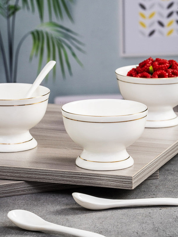 Indulge in timeless elegance with this premium Bone China Dessert Bowl Set with Spoon, beautifully adorned with a 24K gold line. Crafted from fine bone china, each bowl reflects a delicate translucence, exceptional strength, and a luxurious finish — perfect for those who appreciate refined dining experiences.The 24K gold detailing along the rim adds a touch of opulence, making this set ideal for both everyday indulgence and special occasions. Each bowl comes with a matching spoon, thoughtfully designed for comfort and style. Whether serving desserts, puddings, fruits, or traditional sweets, this set elevates presentation and brings a graceful charm to your table. It’s not just tableware — it’s a statement of sophistication and taste. (6pcs Cup : H-6.5cm, R-9.5cm, W-148gm, C-160ml, 6pcs Spoon : L-2.5cm, W-11.5cm, W-20gm)