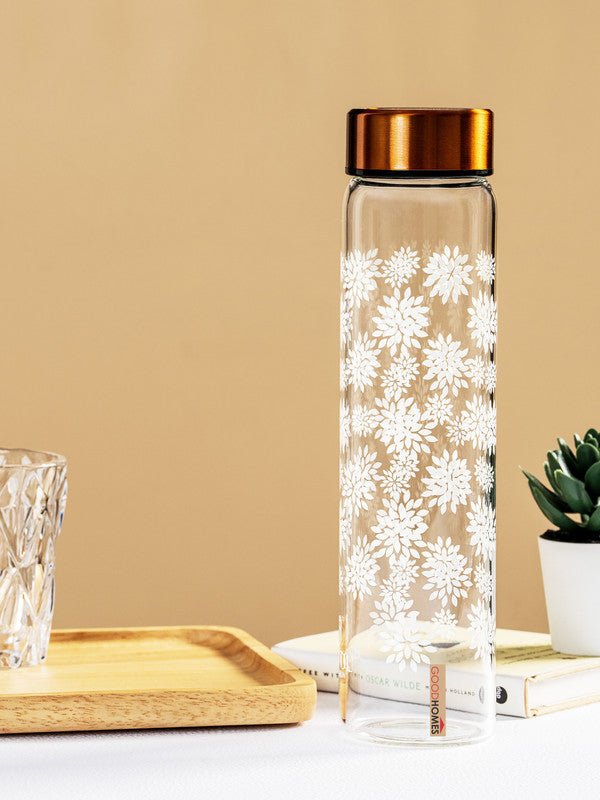Elevate your everyday hydration with this premium Borosilicate Glass Bottle, designed for both style and utility. Crafted from high-quality borosilicate glass, it ensures durability, resistance to thermal shock, and long-lasting clarity – making it a safer, eco-friendly alternative to plastic bottles.The sleek body features a monochromatic all over print, giving it a modern, minimalistic look that complements any lifestyle. The Rose Gold tone metallic cap adds a touch of sophistication, making this bottle stand out on your desk, in the gym, or while travelling.Engineered for convenience, the wide-mouth opening makes it easy to clean and refill, whether with water, infused drinks, or other beverages. Its multipurpose utility ensures it’s perfect for home, office, workouts, or gifting.