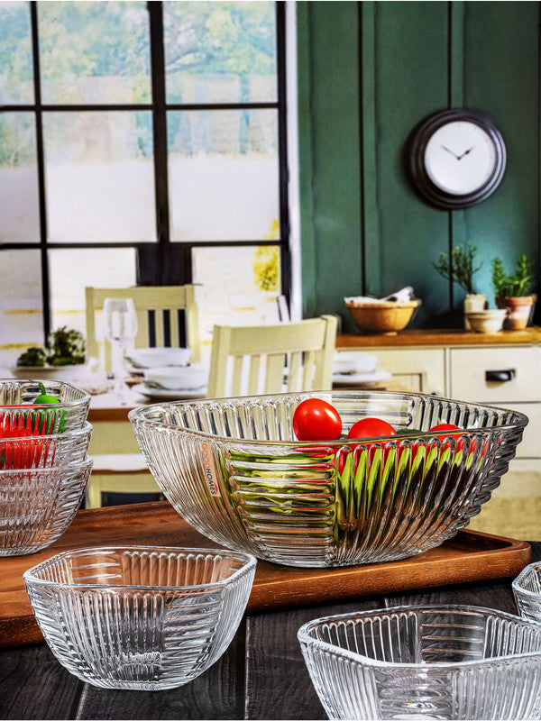 Freshen up your crockery with this stylish glass bowl set in crystal cut design. This bowl set comprising of a serving bowl and 6 small bowls is a versatile item, making it suitable for desserts, nibbles or anything you like. Itis perfect for bringing charm to your dinner table and blends effortlessly with your existing tableware. It is very easy to clean as the crystal cut design is on the outer surface of the bowls. (1pc Serving Bowl : H-8.0cm, L/W-19.5cm, W-794gm, C-1700ml, 6pcs Pudding Bowl : H-5.5cm,L/W-10.0cm, W-192gm, C-260ml)