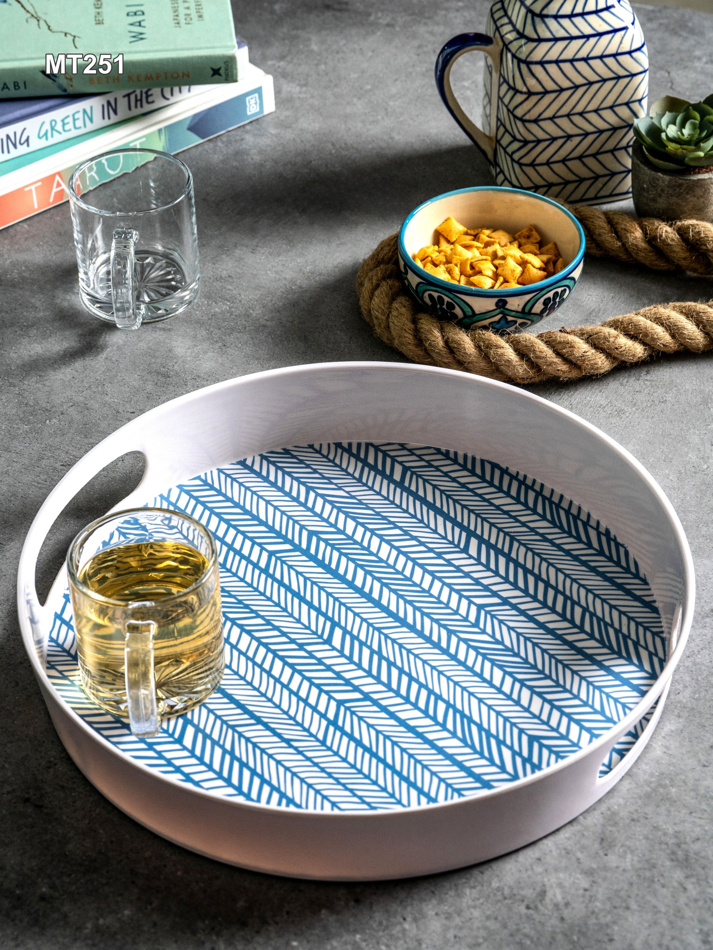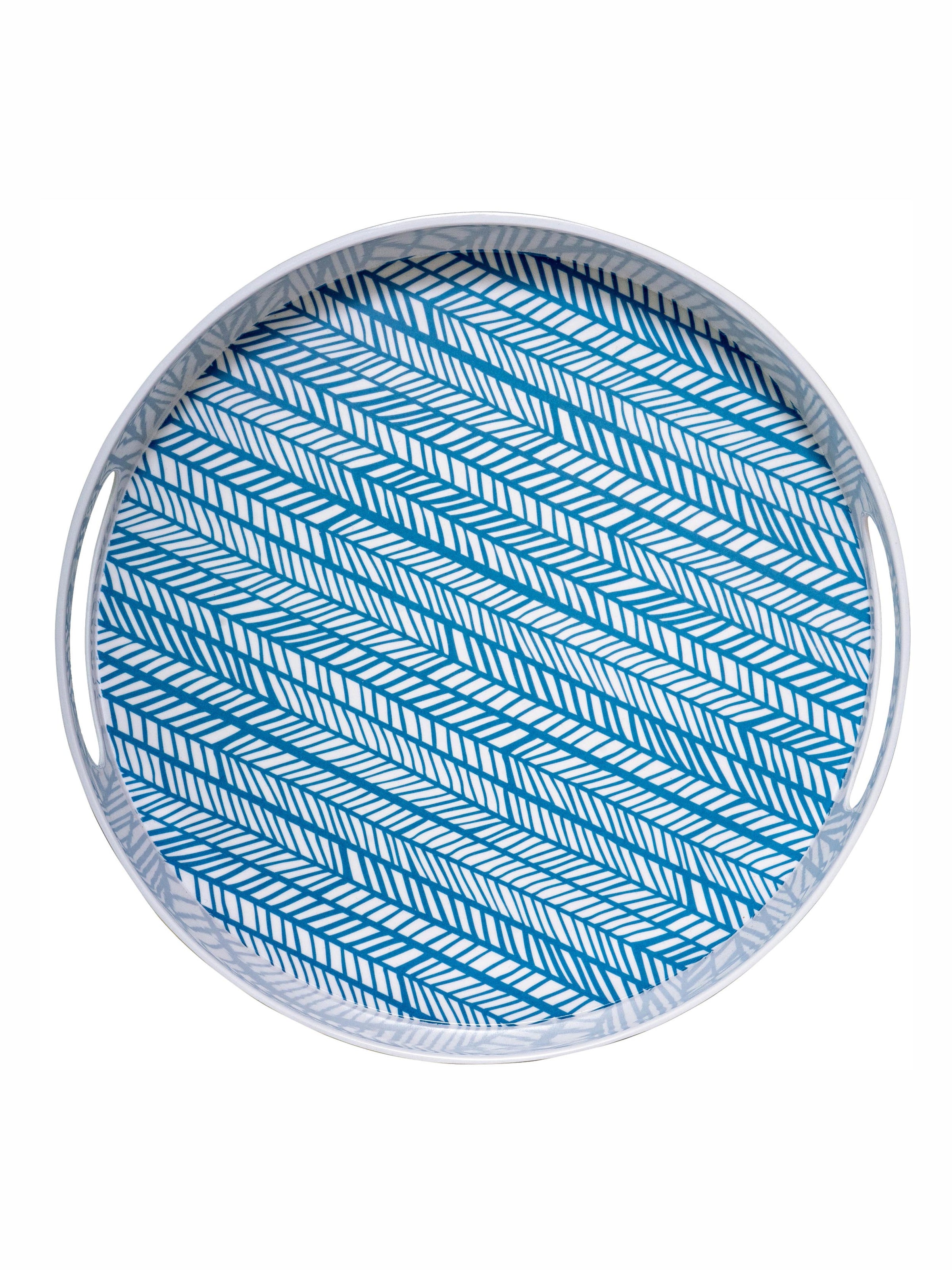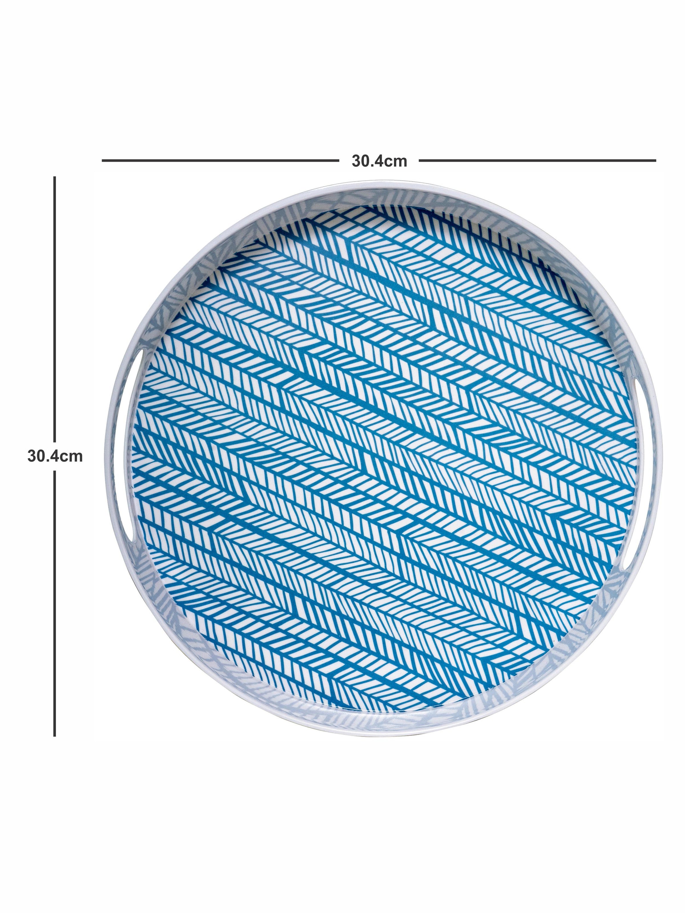 This beautiful round printed Melamine tray with easy-to-grip handles is a practical yet stylish addition to any kitchen and adds a chic element to serving a variety of things. Use this contemporary tray to serve a leisurely breakfast, after-dinner drinks or to bring lunch outdoors on a sunny afternoon. With so many serving options, this durable and easy to clean tray offers a handy yet modern element to any kitchen and will be a great addition to your serving ware.