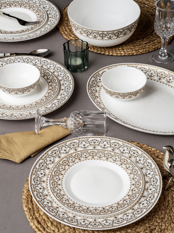 See your dinner table bloom with our stunning 27 pcs dinner set. A wonderful choice for refreshing your dinnerware, this beautiful dinner set is complete in itself to have you covered for any occasion. Decorated with a beautiful classic design, our opal glass dinner set will offer a formal finish to any setting. It is perfect for entertaining guests as well as special meal times with the family. (6pcs Dinner Plate : H-2.6cm, RD-27.5cm, W-462gm, 6pcs Quarter Plate : H-1.7cm, RD-19.0cm, W-236gm, 12pcs Soup Bowls : H-4.7cm, RD-11.5cm, W-142gm, C-240ml, 1pc Oval Platter : H-2.6cm, L-25.0cm, W-33.0cm, W-636gm, 2pcs Serving Bowl : H-9.0cm, RD-20.0cm, W-496gm, C-1370ml)