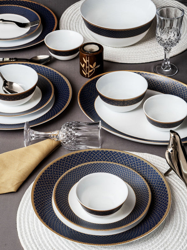 See your dinner table bloom with our stunning 27 pcs dinner set. A wonderful choice for refreshing your dinnerware, this beautiful dinner set is complete in itself to have you covered for any occasion. Decorated with a beautiful ornamental design, our opal glass dinner set will offer a formal finish to any setting. It is perfect for entertaining guests as well as special meal times with the family. (6pcs Dinner Plate : H-2.0cm, Round-27.0cm, W-460gm, 6pcs Quarter Plate : H-1.7cm, Round-19.0cm, W-245gm, 6pcs Veg. Bowl : H-4.5cm, Round-10.0cm, W-170gm, C-200ml, 6pcs Soup Bowl : H-5.5cm, Round-12.0cm, W-170gm, C-300ml, 1pc Oval Platter : H-2.9cm, L-25.0cm, W-33.0cm, W-645gm, 2pcs Serving Bowl : H-8.0cm, Round-19.8cm, W-435gm, C-1370ml)