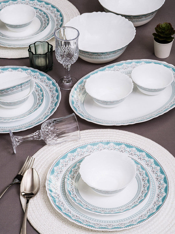 Infuse your dining table with all the fresh charms of the countryside when you use this beautiful blooming floral dinner set. Each piece has been designed to give a handcrafted feel and then finished with delicate florals, lending colour and personality to this modern design. Wherther you are moving into a new home or simply refreshing your dinnerware, this 33 piece dinner set makes for a gorgeous choice. (6pcs Dinner Plate : H-2.5cm, Round-27.0cm, W-454gm, 6pcs Quarter Plate : H-2.0cm, Round-19.0cm, W-228gm, 6pcs Veg. Bowl : H-4.7cm, Round-11.2cm, W-128gm, C-200ml, 6pcs Soup Bowl : H-5.3cm, Round-12.5cm, W-158gm, C-280ml, 6pcs Spoon : L-4.2cm, W-13.5cm, W-32gm, 1pc Oval Platter : H-2.5cm, L-25.0cm, W-33.0cm, W-610gm, 2pcs Serving Bowl : H-7.8cm, Round-20.0cm, W-416gm, C-1370ml)