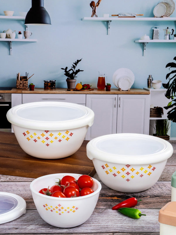 This multi purpose Opal bowl makes it easy to refrigerate leftovers, freeze pre-prepared meals or warm them all up again. It is safe for use in the fridge and in the microwave with its plastic lid removed. It comes in handy when you want to take a small portion to a friend's place. It will help keep your kitchen and fridge neatly organised. This bowl comes with a lid which helps keep food fresh for a longer period. The bowl is sure to add a touch of style when used to serve food directly on the table. This set of 3 lidded dishes nests together to save space in the kitchen cupboard as well as the refrigerator. (1pc Large : H-10.0cm, R-19.5cm, TD-18.5cm, W-818gm, C-1500ml, 1pc Medium : H-9.0cm, R-17.5cm, TD-16.5cm, W-598gm, C-1000ml, 1pc Small : H-7.5cm, R-13.5cm, TD-12.5cm, W-312gm, C-500ml)